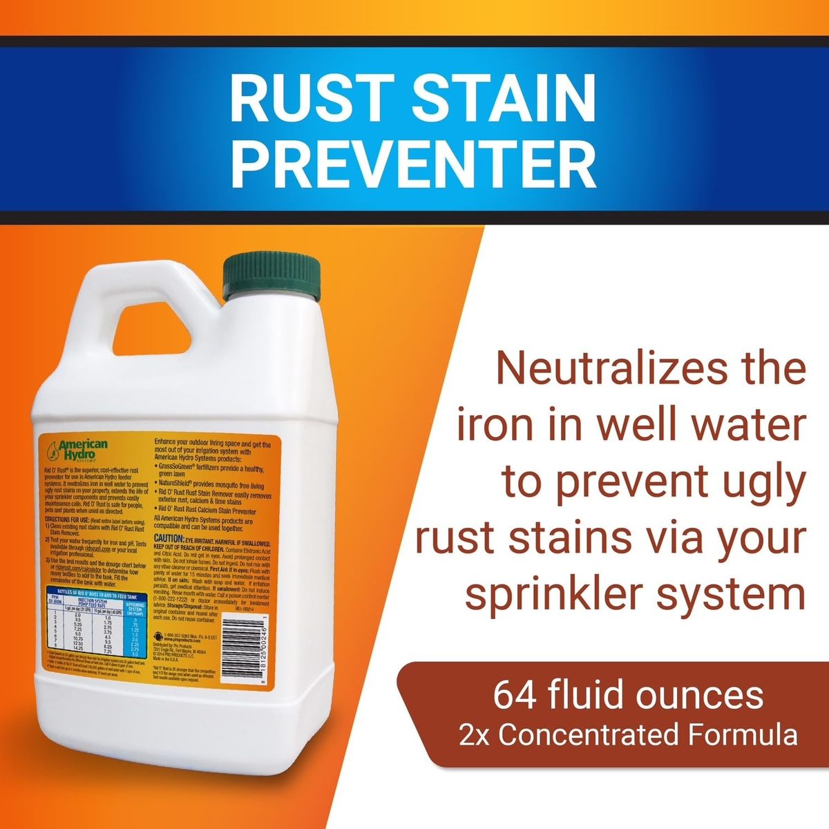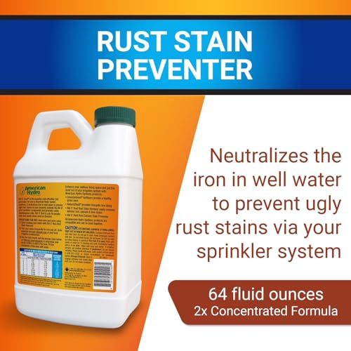 Protect your landscaping with Rid O' Rust RR1, America's No. 1 selling rust preventer featuring a powerful 2X formula twice as strong as original formulas. This premium rust and stain remover effectively prevents ugly rust stains and scaling from irrigation well water through injection or siphoning systems. Designed for water with pH 6+ and any hardness level, just 1/2 gallon treats 125,000 gallons of water with 1 ppm iron. Use in place of Formula 500 and Formula 2000. Trusted by professionals since 1995, Pro Products LLC delivers superior rust prevention solutions that keep outdoor surfaces pristine and rust-free. Each 64 oz. bottle is meticulously inspected for quality and reliability, ensuring long-lasting protection for your irrigation system and maintaining clean, stain-free environments year-round. Compatible with American Hydro Systems, this advanced formula works seamlessly with existing equipment for hassle-free installation.