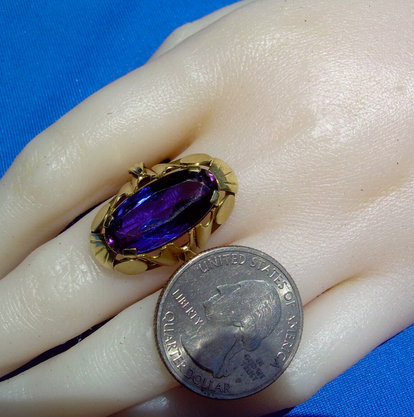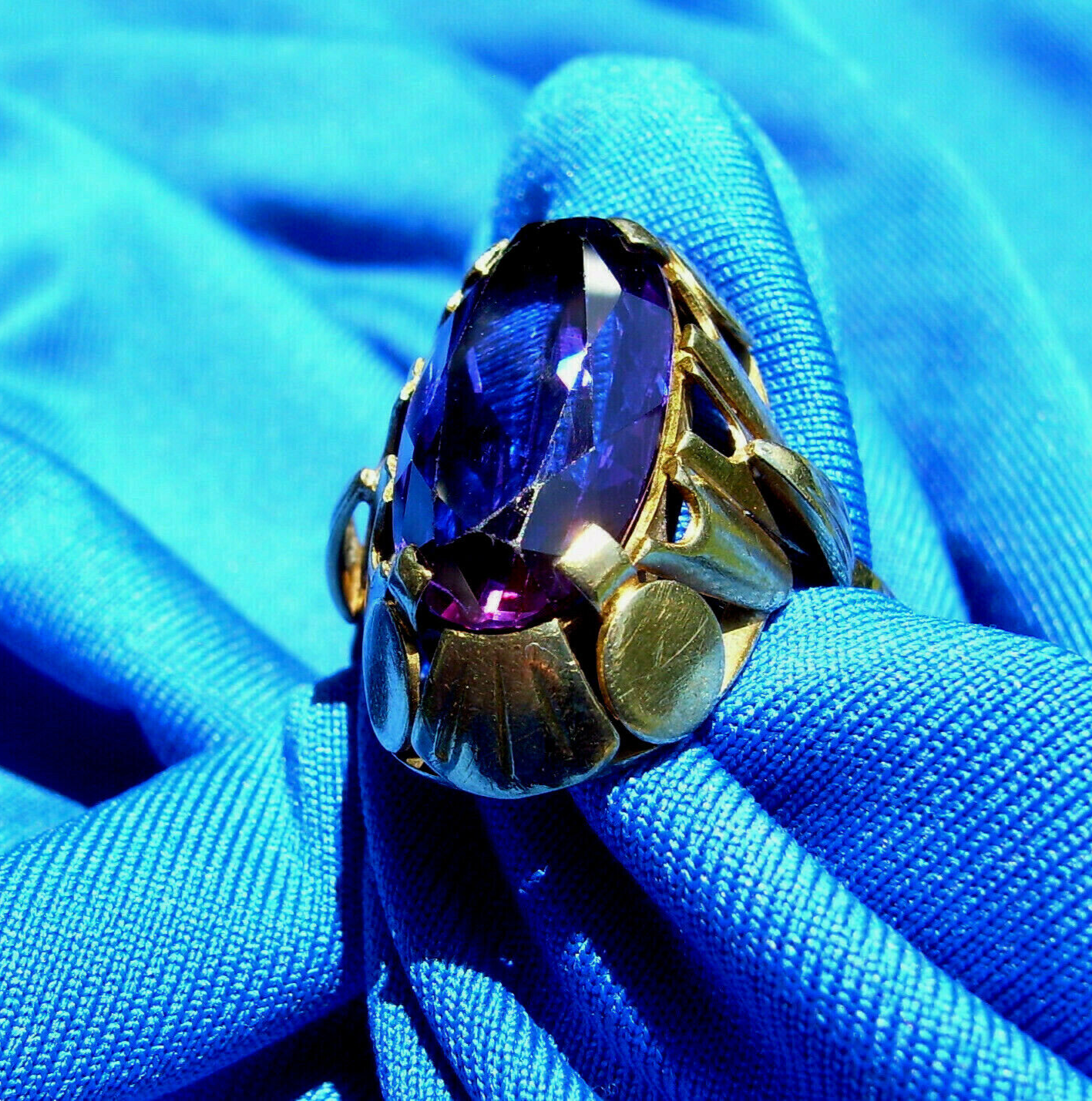 ELEGANT AMETHYST 14K GOLD DECO STATEMENT RING.