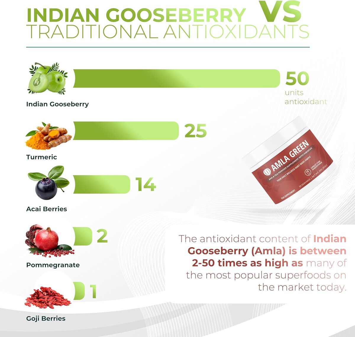 THE ORIGINAL 20X CONCENTRATED AMLA SUPPLEMENT: Amla Green is your daily superfood powder supplement delivering unmatched antioxidative support through 20x concentrated amla with an ORAC Value of 261,500, which is 75 times higher than goji berries. Supported by published research, including clinical trials, amla has shown positive results for youthful benefits and critical areas of vitality and health.