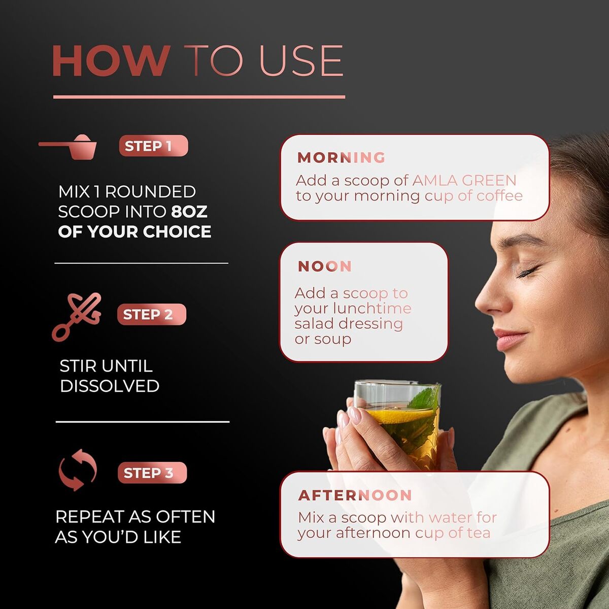 DAILY SUPERFOOD TEA: With over 10,000 daily active users, Amla Green is the go-to source for antioxidative benefits mixed into smoothies, breakfast bowls, or as a hot or cold morning or evening tea. One scoop per day provides a natural method for supporting your most critical areas of health, with a smoother taste and better flavor than traditional amla supplements.