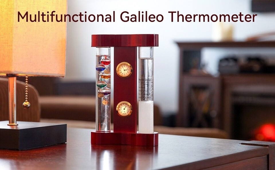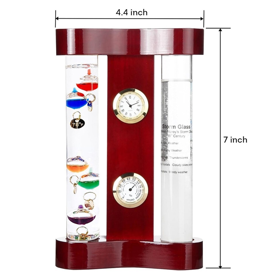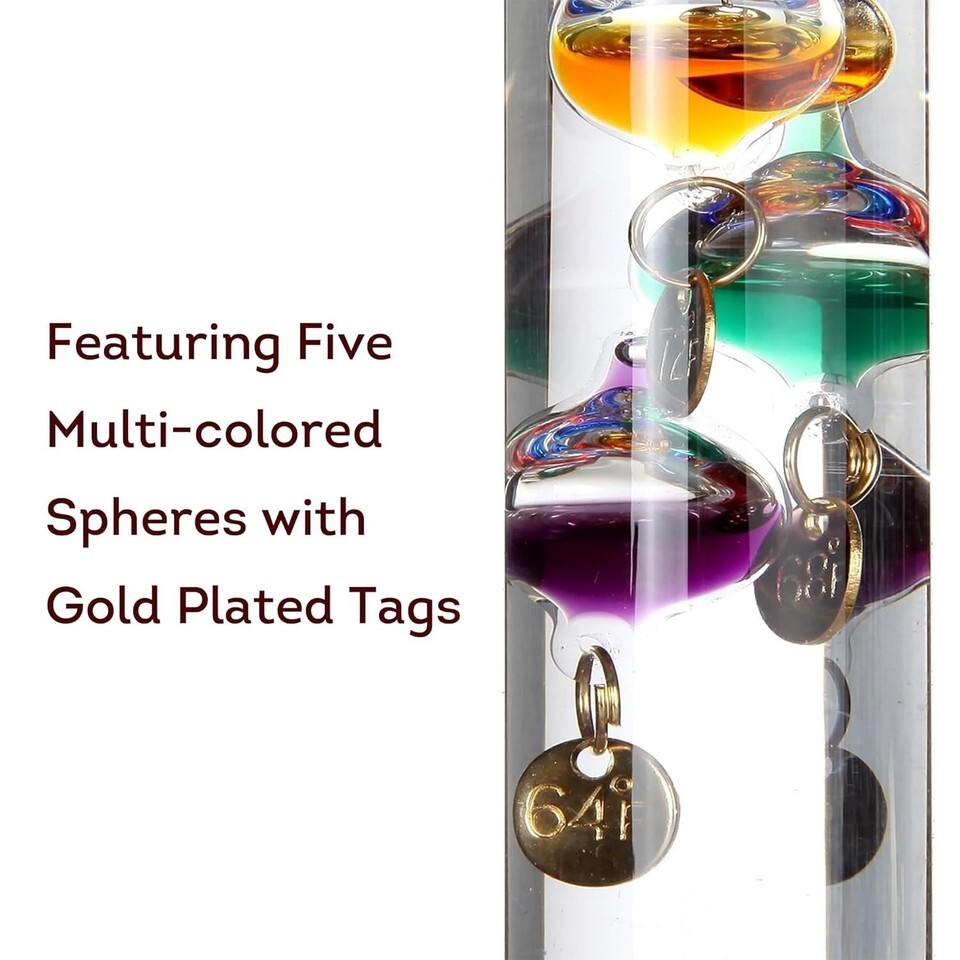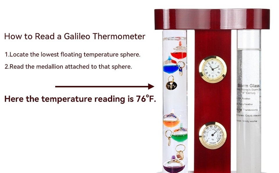 Weather buffs can create their own forecasts and track daily trends with these quality instruments then watch the temperature floaters float up and down the glass tube to determine the current temperature. Our Galileo thermometer shows temperatures of 64 to 80 degrees. Compact size fits on narrow surfaces like shelves, desks, mantels or bedside tables. Measures 7" tall x 4.3? wide x 1.5? deep.