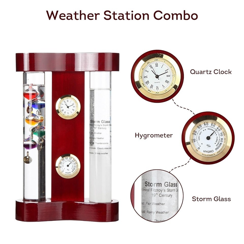 The Around The Clock Shop FitzRoy's Storm Glass works to predict weather patterns 1-2 days in advance, helping you manage your days so you can plan ahead. It provides a weather indication without depending on any external methods. It can predict changing weather conditions such as sunny, cloudy, fog, storms, snow, and more!