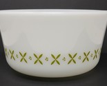 The Anchor Hocking Fire King Mixing Bowl is a vintage collectible bakeware piece from the 1960s, featuring a round shape with a white and green color design. This measures approx. 9" wide and 5" tall with a few scratches.