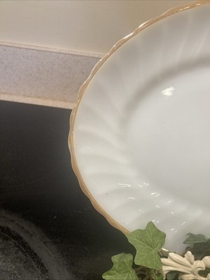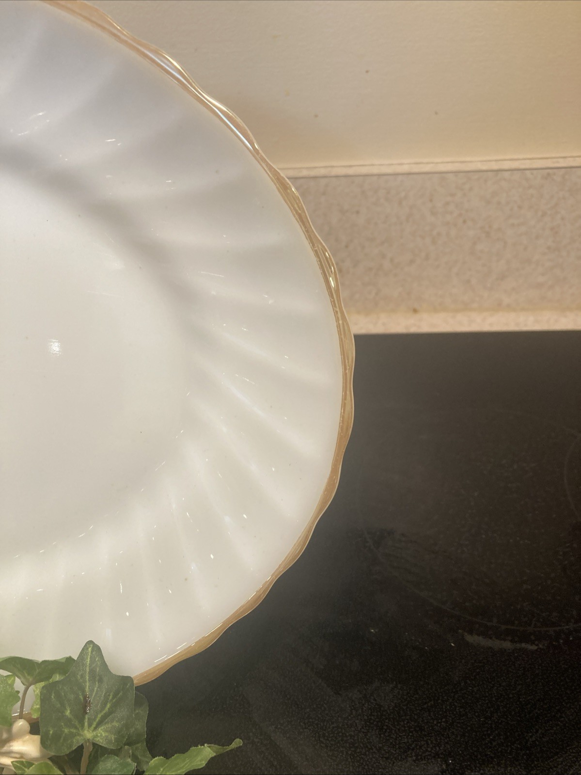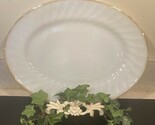The Anchor Hocking Fire King Swirl Golden Gold Shell Lustre 13" Oval Serving Platter is a classic and elegant piece of milk glass dinnerware from the Fire-King product line. Featuring a beautiful white swirl pattern and a luxurious gold shell lustre finish, this platter adds a touch of sophistication to any dining table. Made by the reputable brand Anchor Hocking, this platter is a timeless and versatile piece that can be used for serving a variety of dishes with style and grace.