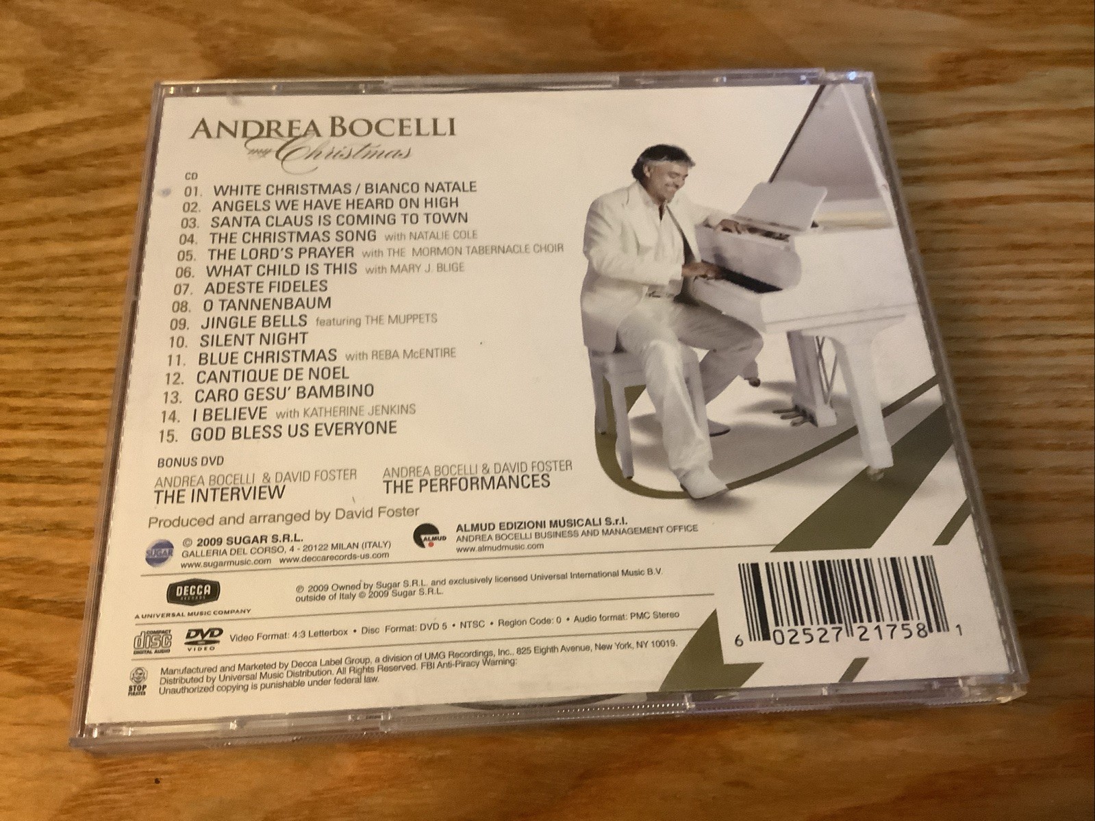 CD and bonus DVD from Andrea Bocelli featuring Christmas music. Very good condition. See photos for songs. Feel free to email with questions. I do combine shipping on multiple items. Have a great day!