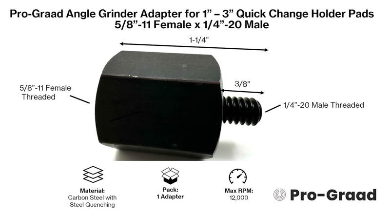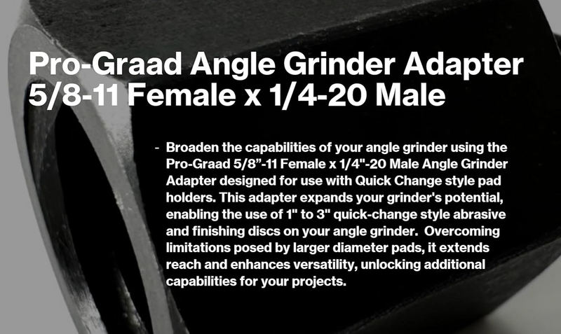 [APPLICATION]: Broaden the capabilities of your angle grinder effortlessly using the Pro-Graad 5/8?-11 Female x 1/4"-20 Male Angle Grinder Adapter designed for use with Quick Change style holders. This adapter expands your grinder's potential, enabling the use of 1" to 3" quick-change style abrasive and finishing discs on your angle grinder. Overcoming limitations posed by larger diameter pads, it extends reach and enhances versatility, unlocking additional capabilities for your projects.