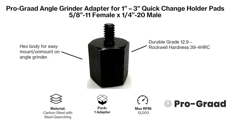 The Pro-Graad Angle Grinder Adapter, featuring a 5/8-11 Female x 1/4-20 Male design, serves as an arbor adapter compatible with Roloc, Roll Lock, Type R, Type S 1? ? 3? Quick Change Holders, specifically for angle grinders with 5/8?-11 threads. Notably, the package includes one Pro-Graad 5/8-11 Female 1/4-20 Male Arbor Adapter, catering to 1? ? 3? Quick Change Holder Pads (Quick Change Pad Holders not included). Engineered for durability, this adapter undergoes steel quenching treatment, boasting a Grade 12.9 with a Rockwell hardness of 39-44HRC, ensuring exceptional longevity and reliability. Its application is tailored for 5/8-11 threaded angle grinders, delivering consistent performance with 1? ? 3? Quick Change Style Pad Holders. The adapter broadens the angle grinder's functionality effortlessly, enabling the utilization of 1" to 3" quick-change abrasive and finishing discs. Overcoming limitations presented by larger diameter pads, it extends reach and versatility, empowering projects with expanded capabilities. This accessory becomes a valuable asset for those seeking enhanced adaptability and prolonged utility from their angle grinders.