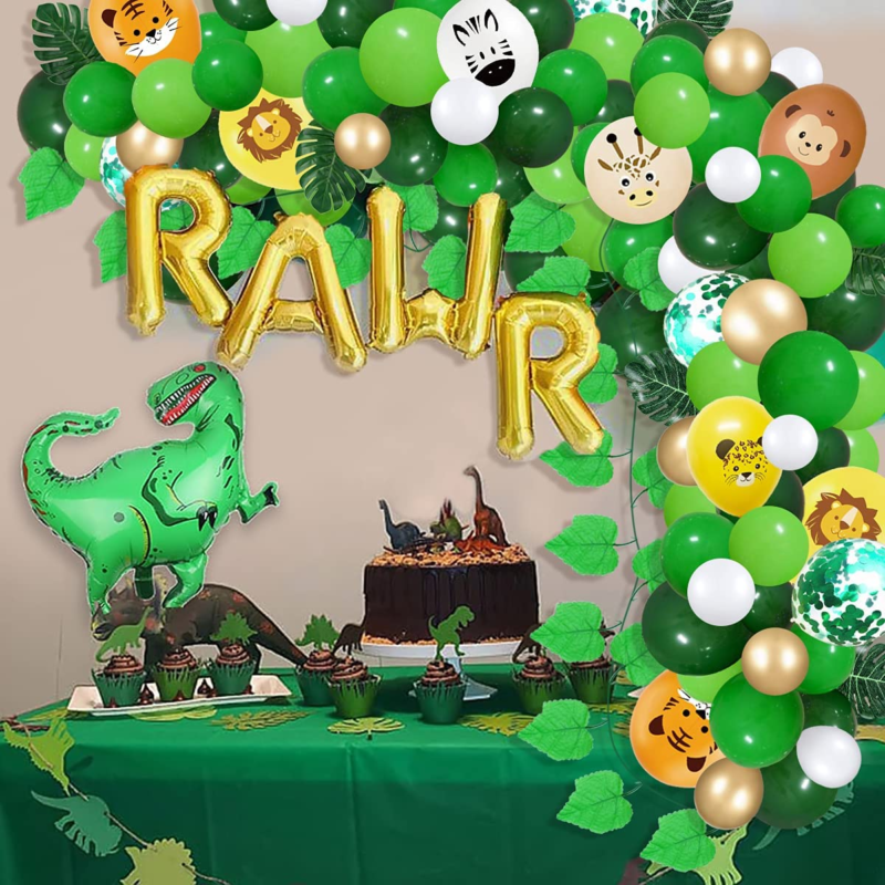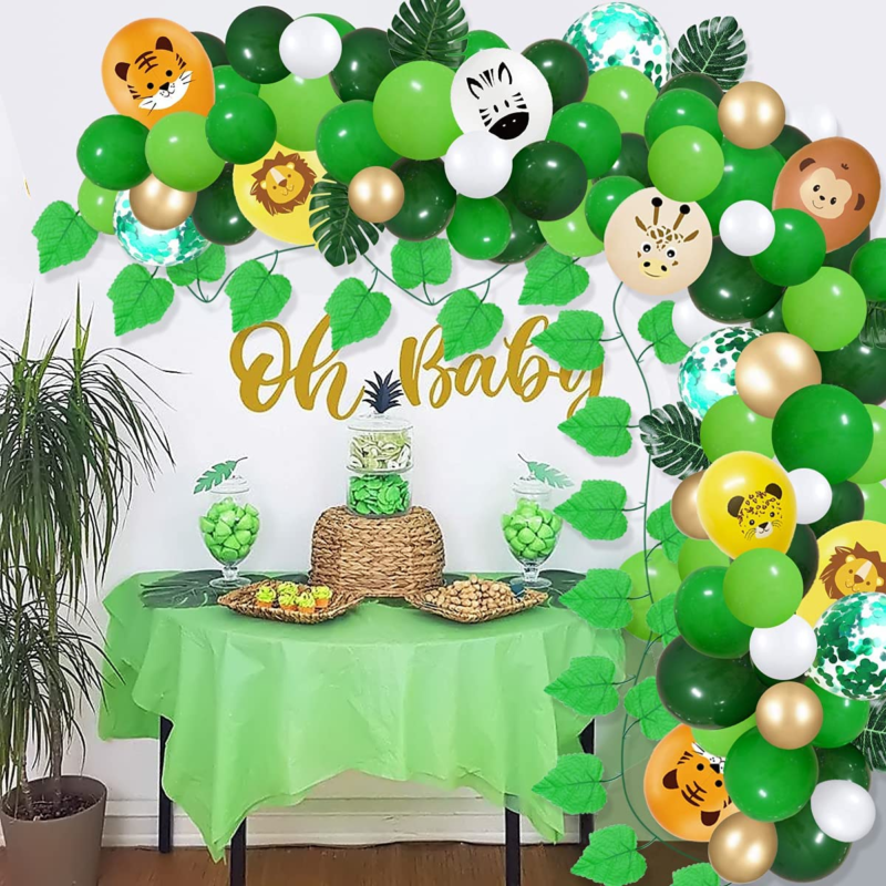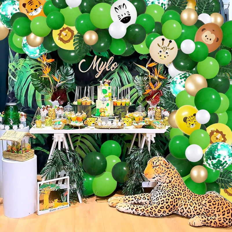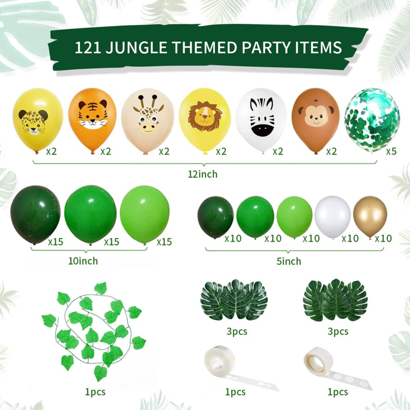 ?Tropical Safari Party Decorations?: Green white gold balloon garland arch kit includes 12 inch tiger/ lion/ zebra/ monkey/ leopard/ giraffe animal print balloons balloons(12Pcs), 12 inch green Confetti balloons(5Pcs), 10 inch light green/green/dark green balloons(15Pcs),5 inch light green/green/Dark green balloons(10Pcs), 5inch white balloons(10Pcs), 5 inch metallic gold balloons(10Pcs), fake vines(1Pcs), artificial palm leaves(6Pcs), 1pcs 100 glue points and roll of a 16ft garland strip.