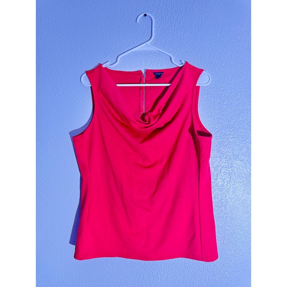 Elevate your wardrobe with this bold and classic Ann Taylor sleeveless blouse. Crafted in a vibrant red hue, this top features a stylish drape neckline and an exposed gold-tone zipper at the back for a modern finish. Perfect for both office wear and evening outings.