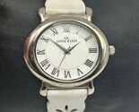 The watch features a sleek silver-tone finish with a contrasting white leather band. The watch has a new battery so it's ready to wear and enjoy.