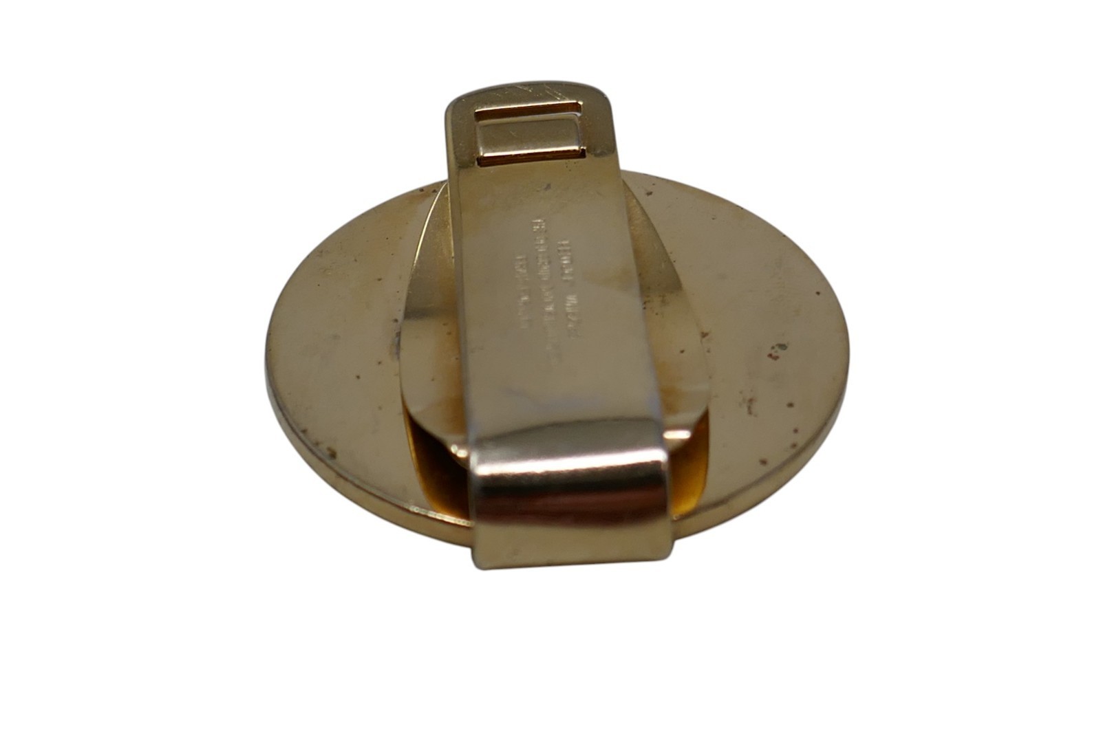 The Anson Old Grand Dad Head of the Bourbon Family Vintage Money Clip is a stylish accessory for men, featuring a solid gold color and a vintage design. This money clip is a unique and eye-catching piece that measures approx. 1.75" tall and 1.625" wide with wear.