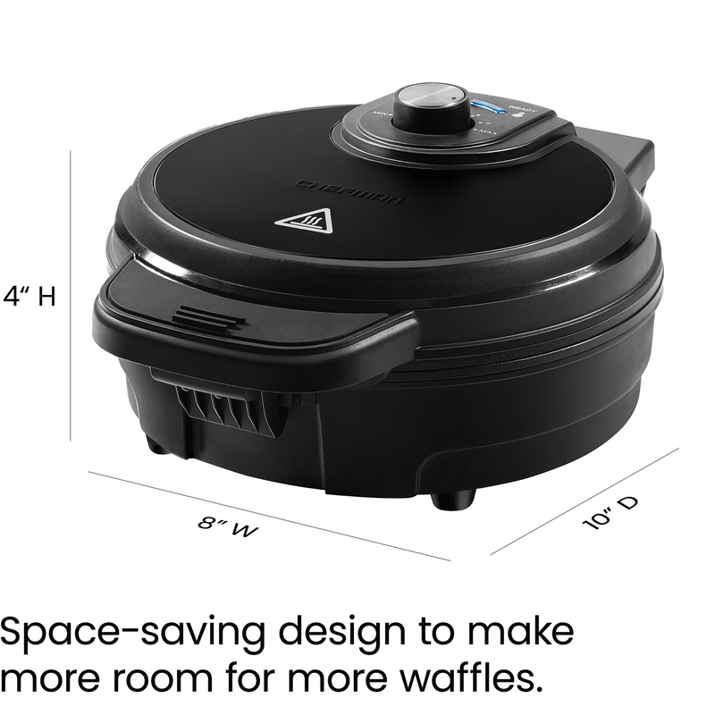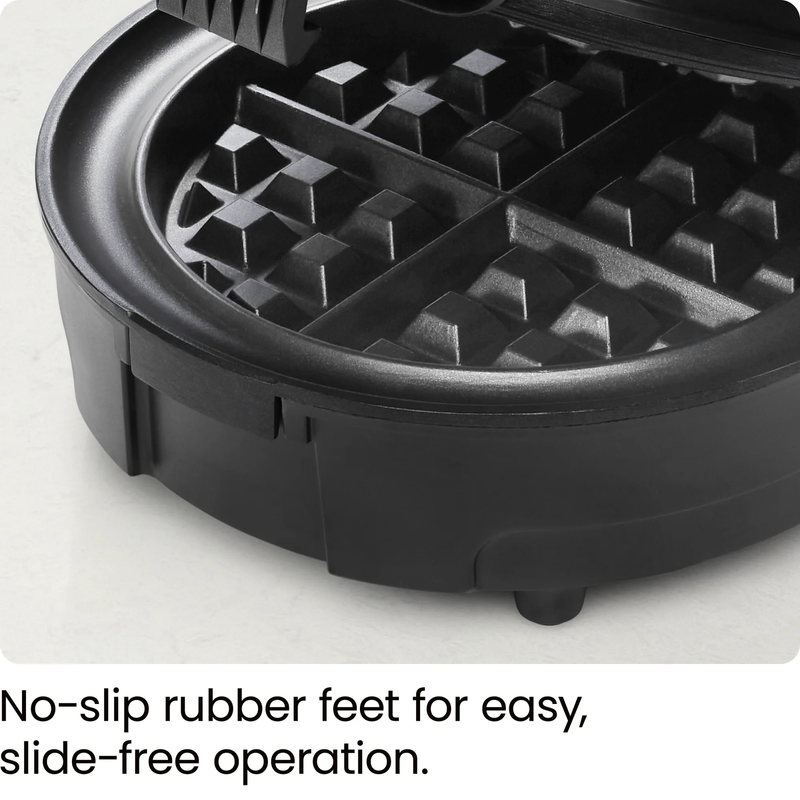 MESS-FREE: Get the gourmet breakfast you crave without any added hassle or mess. Our stress-free anti-overflow moat makes fluffy waffles without leaving behind a drippy mess. CUSTOMIZED CRUNCH: Make crispy and delicious waffles with large and deep pockets for syrup. Have them just the way you like with 7 temperature control settings. LOCKING LID: Pour, close, and lock in the flavor. The spill-proof iron locking latch keeps the dual nonstick plates from separating from the heat and pressure, preventing the batter from overflowing onto your counter. EASY-TO-CLEAN SURFACES: The non-stick coated plates easily wipe down with a damp sponge or rag, keeping clean-up simple and your waffle maker looking like new. SIZED JUST RIGHT: Makes 6-inch round waffles that fit perfectly on your plate. CREATIVE MEALS: Create sweet or savory waffles in minutes for breakfast, lunch, brunch, dinner, or dessert! Mix it up and get creative with chocolate chip, pizza, or cinnamon roll waffles. SPACE SAVING: When not in use, our waffle iron stands upright for easy storage in small spaces. Keep your kitchen organized and your waffle maker handy. PERFECT POUR: Measuring cup included so you get the right amount every time. No need to guess how much batter you need, just fill, pour, cook, and repeat.