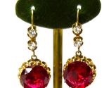 These are a pair of antique 10K yellow gold lab ruby and rock quartz leverback earrings. The rich red color of the lab-created ruby main stones is combined with the secondary rock crystal stones, that creates a beautiful and unique design. Viewed from the front the depth of the stones makes them appear deep red, though from the side or reverse side they appear deep strawberry pink. The stones are large, 13.9 mm and about 7.7 mm deep. Together both earrings weigh 8.4 grams. Read further for more info on these earrings.