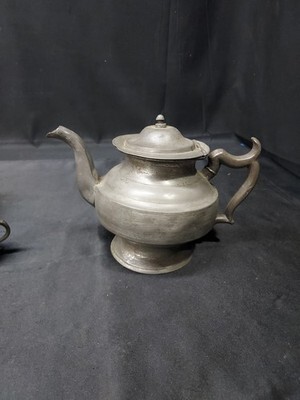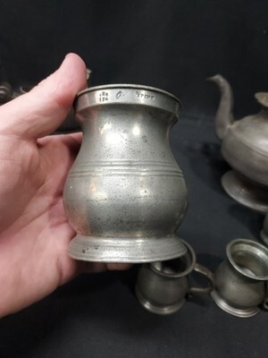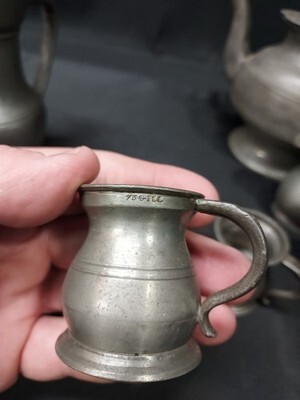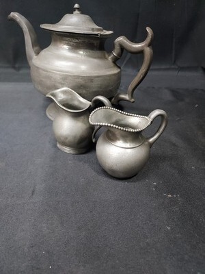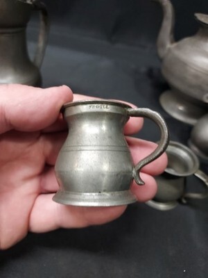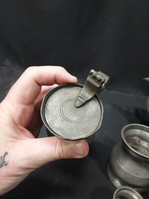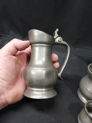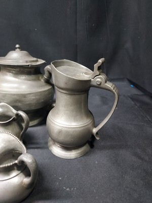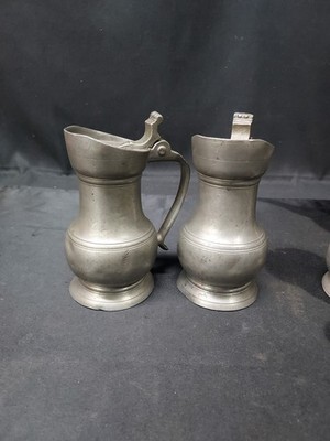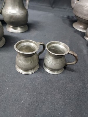 - Antique 1700's Pewter Lot Of 8, Flagon Tea Pot Measures Creamers, 18th Century