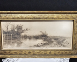 Beautiful antique monochromatic etching signed in plate by I.M. Rosenberg, dated 1889 and published by Jelenek J. Jacobson, New York. This monochromatic landscape print features an intricately detailed riverbank scene with tall grasses, trees, and a wooden fence. At the bottom, a subtle yet striking moment is captured?a snake slithers through the grass while a bird, possibly a crow, watches nearby, I believe this to be a trademark of the Jelenek J. Jacobson Printing Company.