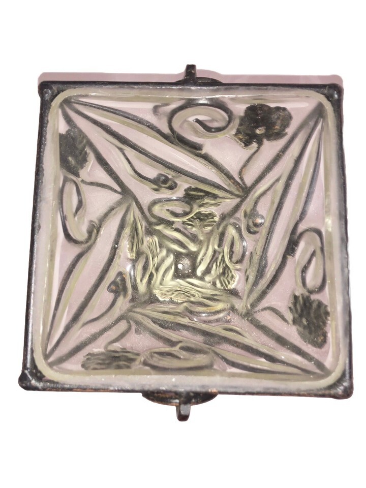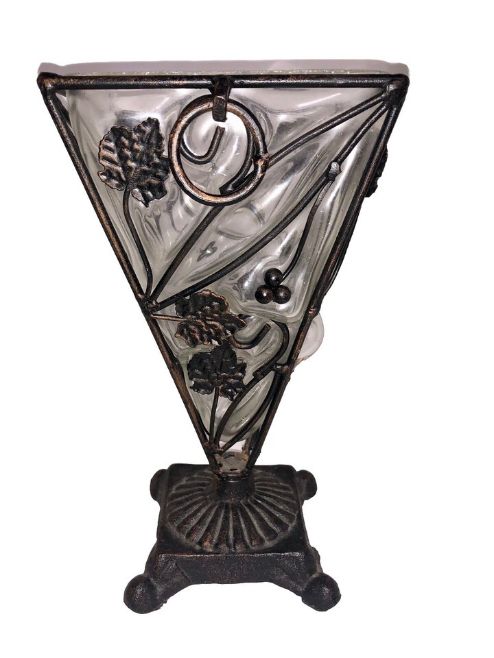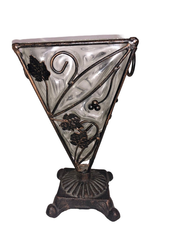 ANTIQUE 1890-1910 HANDMADE Blown Glass CAGED GLASS and CAST IRON VASE LARGE 9.5”