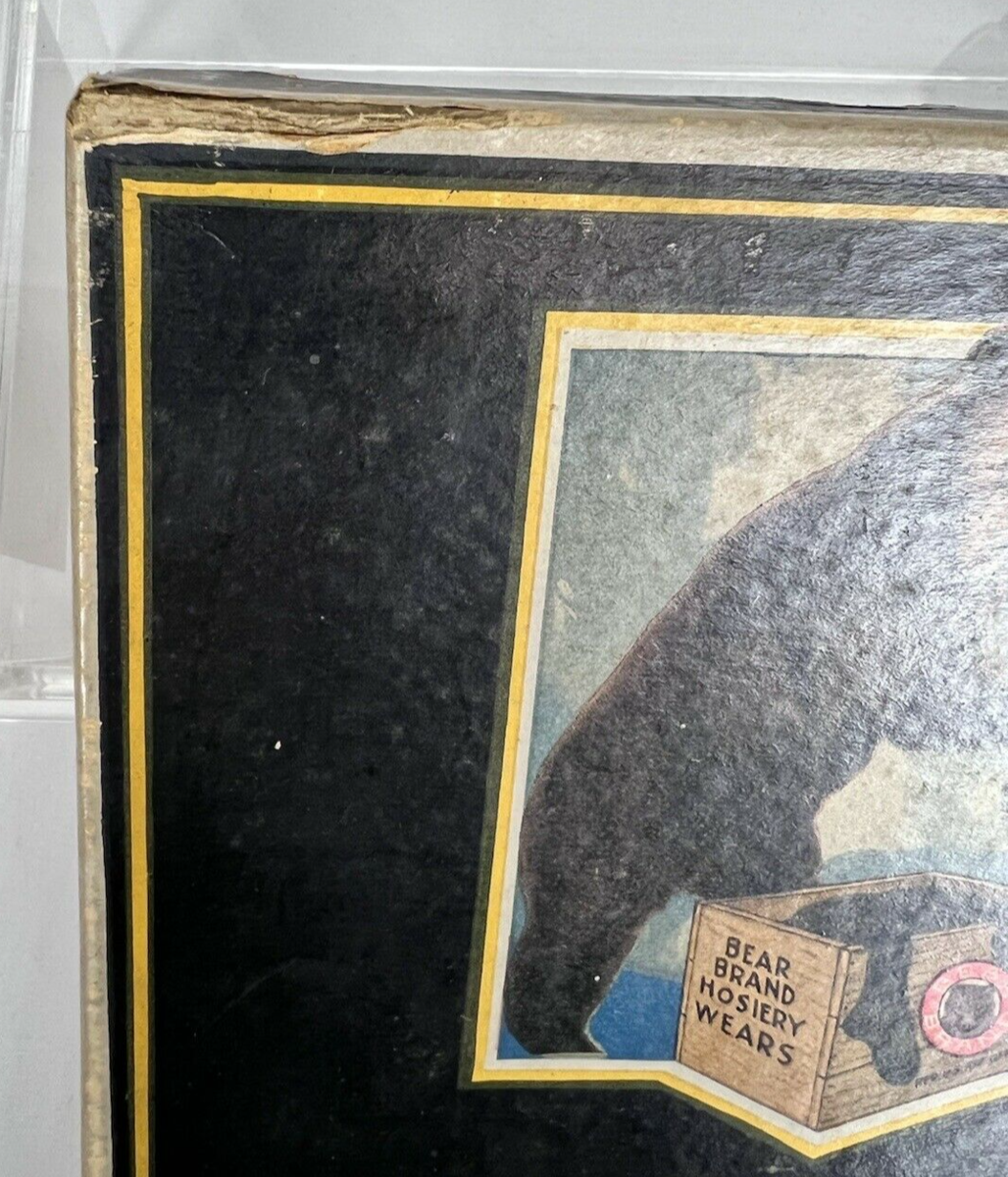Antique 1898 Cardboard Bear Brand Hosiery Box is Empty 1 1/2 x 6 1/2 x 9 1/2". Fun Bear Graphics are Clear and bright. Overall Good condition. Box is quite intact. A couple of scrapes in color on box top. And, some peeling damage on 2 corners. See photos.