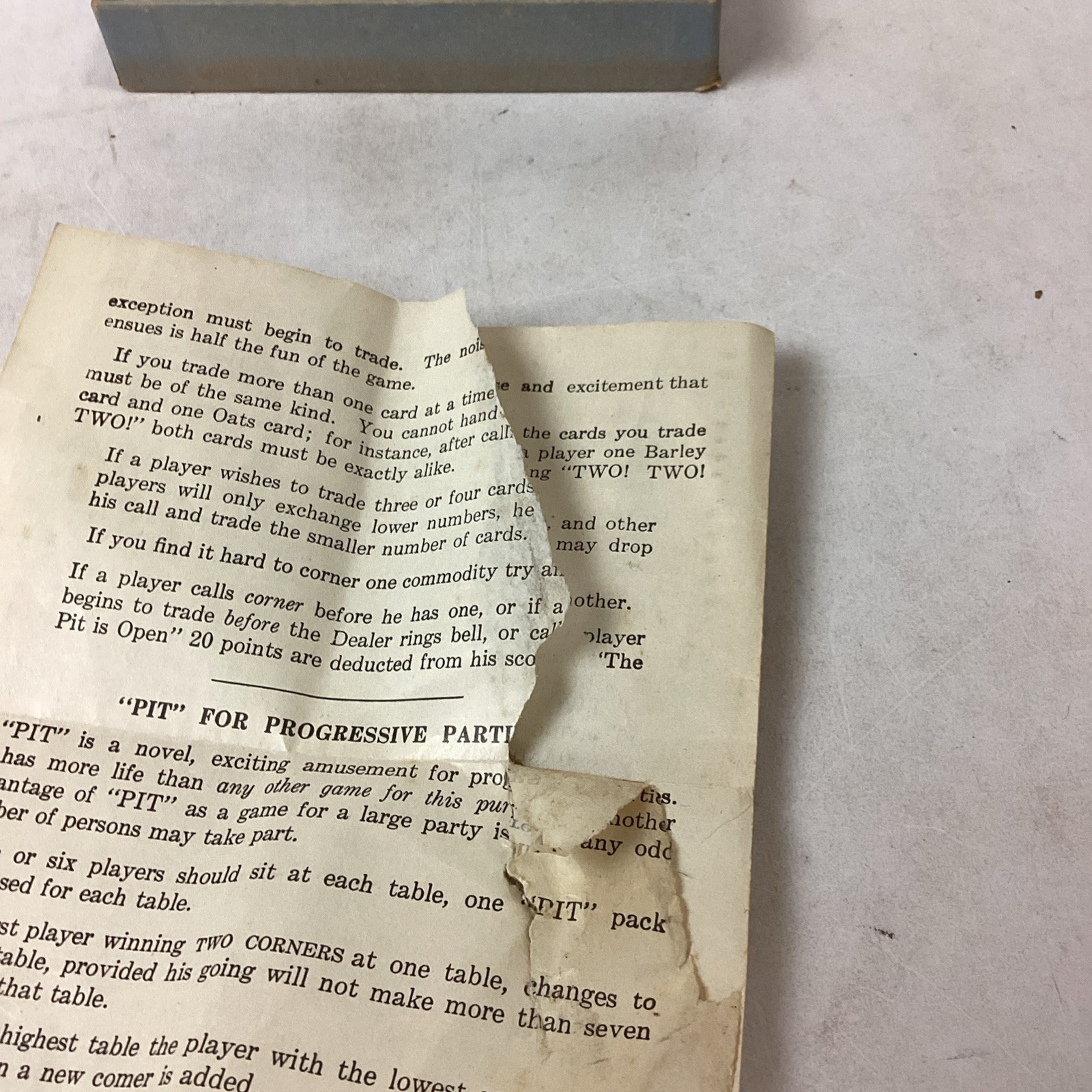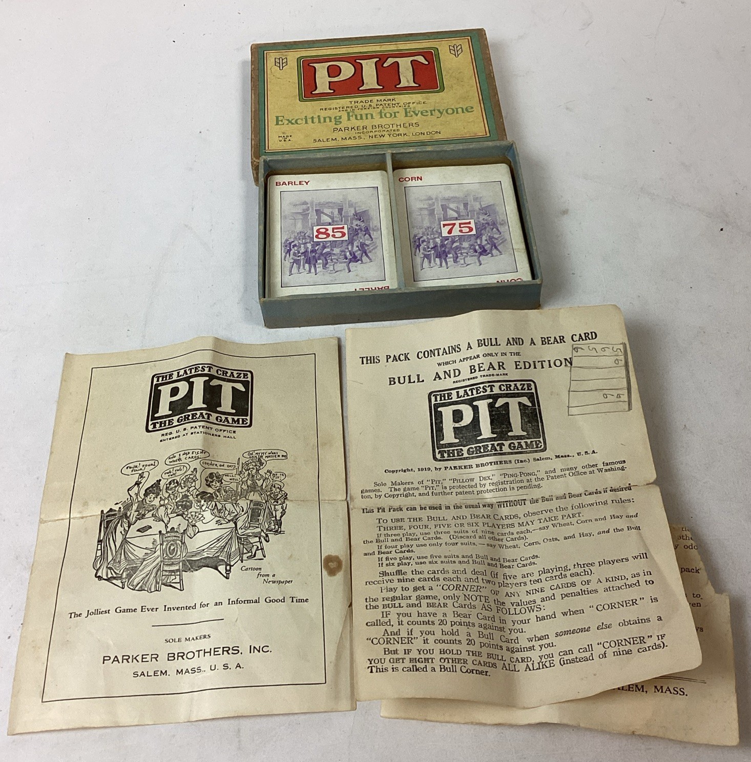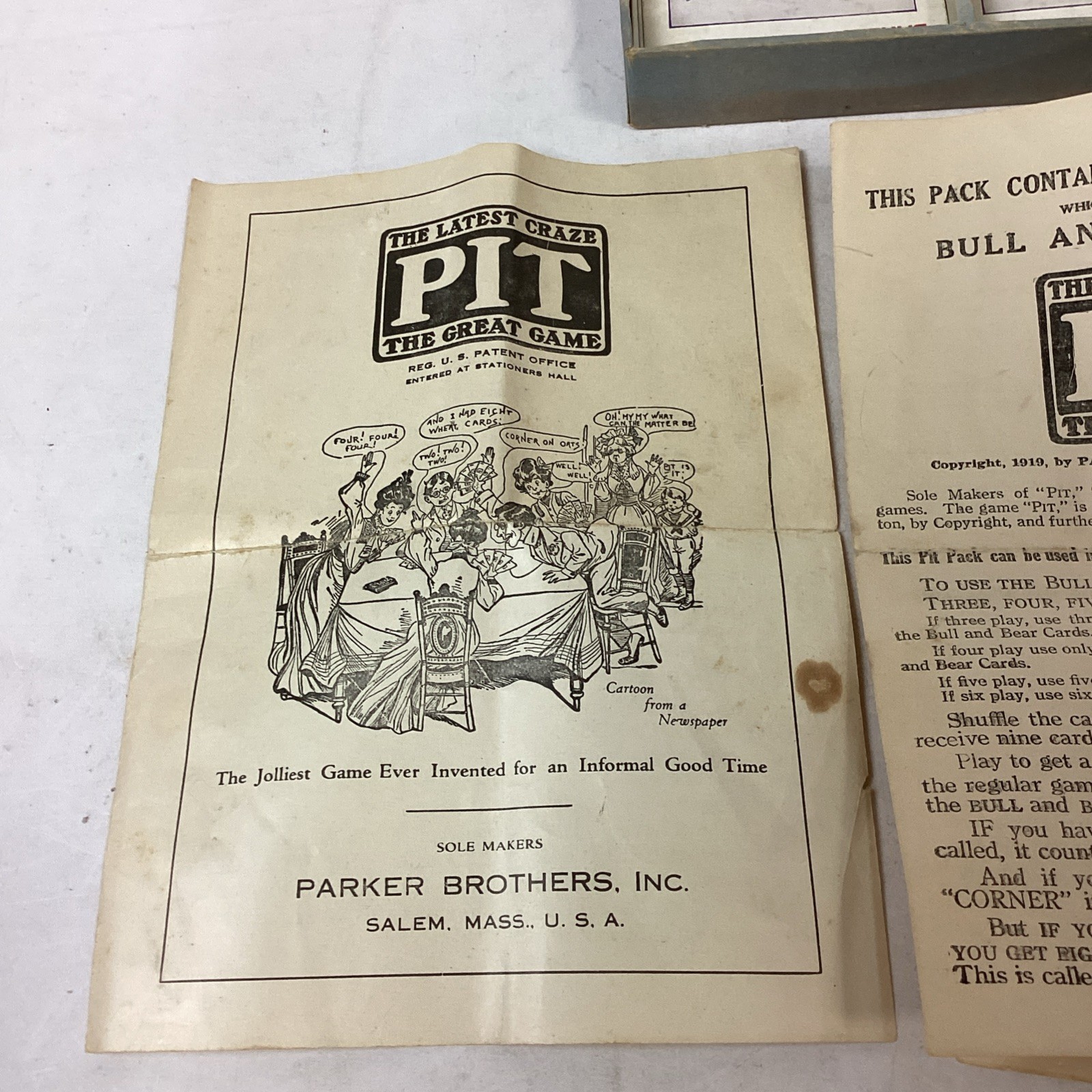 Antique 1919 Parker Brothers PIT Card Game - Bull Bear Special Edition. This edition is rare. In used condition. The cards feel dirty and will need to be cleaned. Comes with original box, instructions and cards. One card is torn. Both parts included. The instructions, one page is ripped but it?s all included.