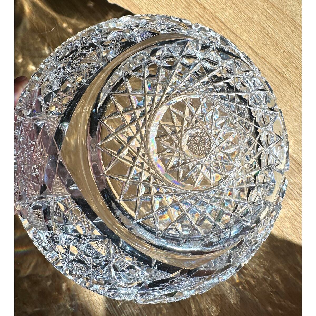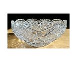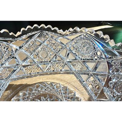 Antique American Brilliant Period Cut Glass Large Bowl Diamonds Hobstars Fans-Presented is an exquisite antique American Brilliant Period Cut Glass large bowl.It is a wonderful hand-cut. The lead crystal is beautiful and clear. This bowl is ABP American Brilliant period. It dates circa the 1890s through 1910.Any could have made this bowl of the following exceptional makers:Hawkes, Libbey, Dorflinger , Egginton, Hoare, Jewel, Meriden, Sinclaire, Tuthill, or Fry. This piece is in excellent overall condition. There are a few minor chips to the saw tooth rim but nowhere else. There are no cracks and no repairs. Enjoy this lovely American Brilliant Period bowl for your next celebration! Diameter: 9 inches; Height: 4 inches;3/8" thick. It is HEAVY.
