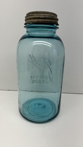 This antique Ball jar is a rare find for collectors of modern era bottles. The deep blue color and "Perfect Mason" label make it a unique addition to any collection. Manufactured in the United States between 1910-1923, this quart size jar is in excellent shape and has not been modified. It is a must-have for any bottle enthusiast.