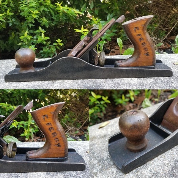 Vintage / antique plane tool from an estate sale. Marked "Made in USA" on the metal. Hand engraved "C Feray" on the wood handle.