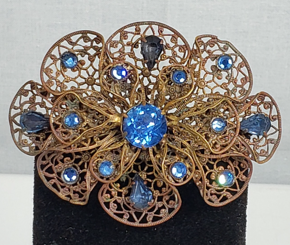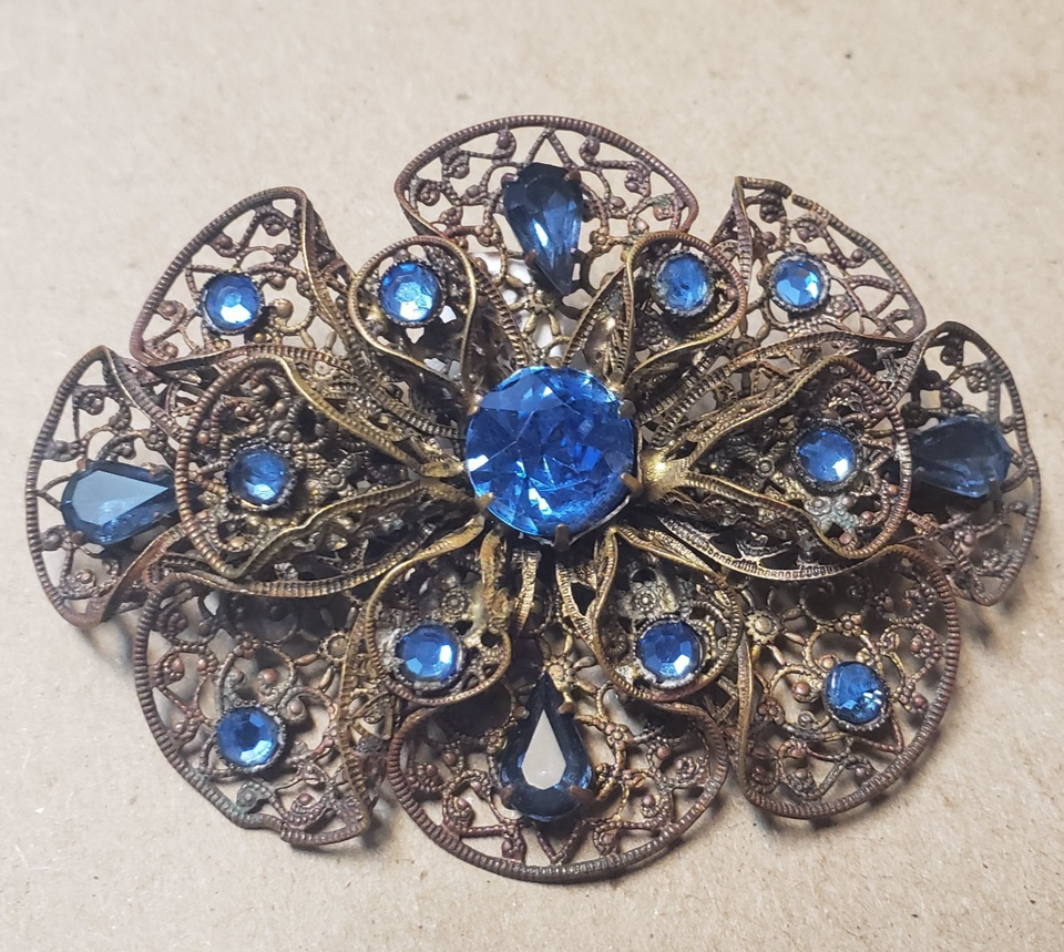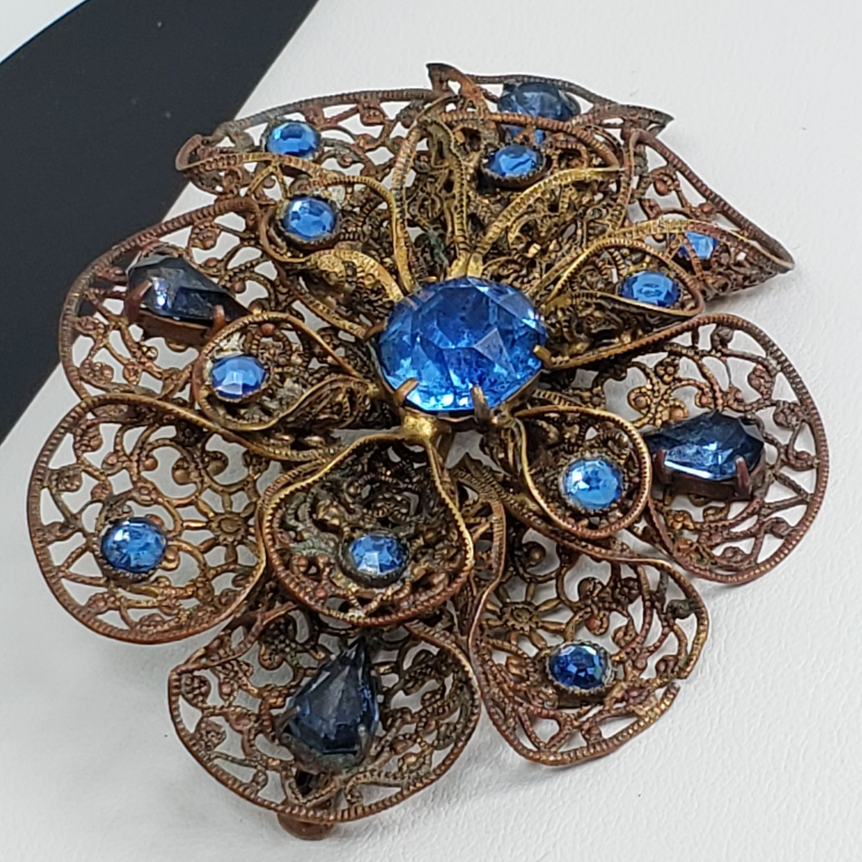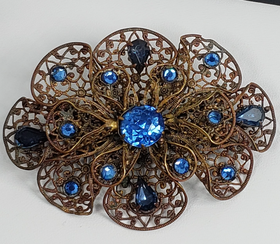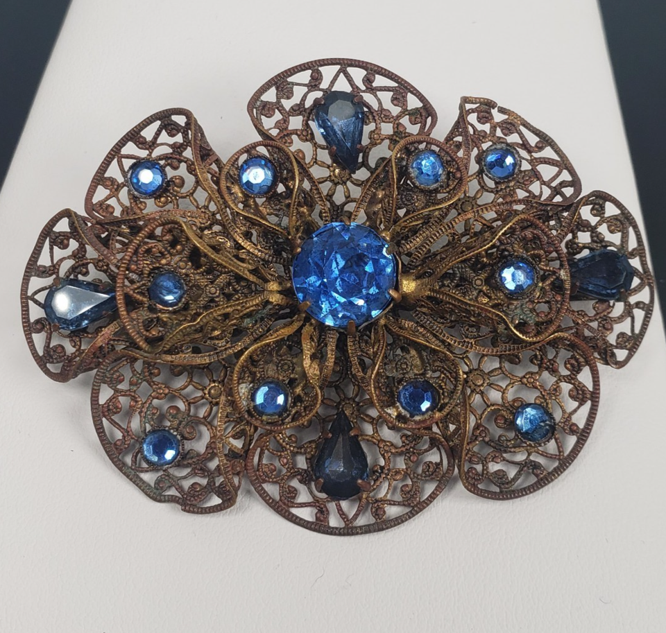 - Antique Czech Art Deco Large Blue Glass Gold Tone Filigree Brooch