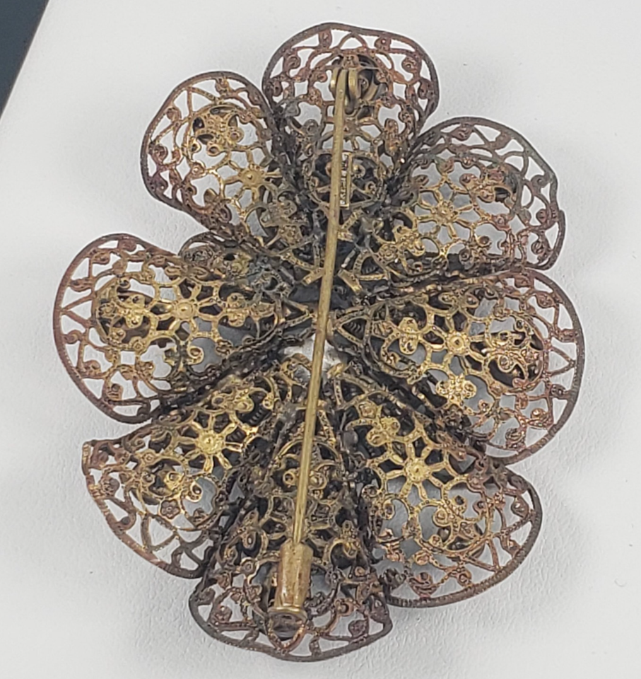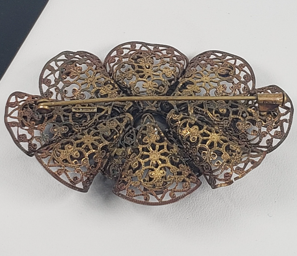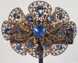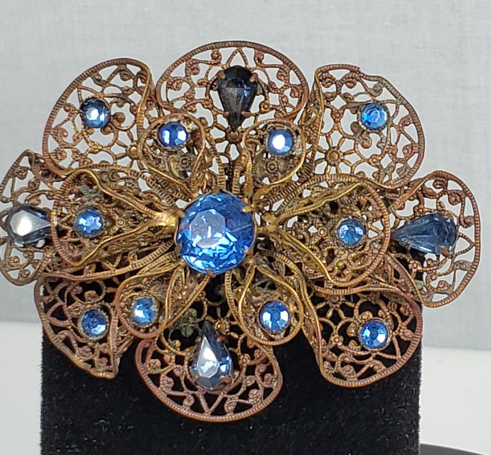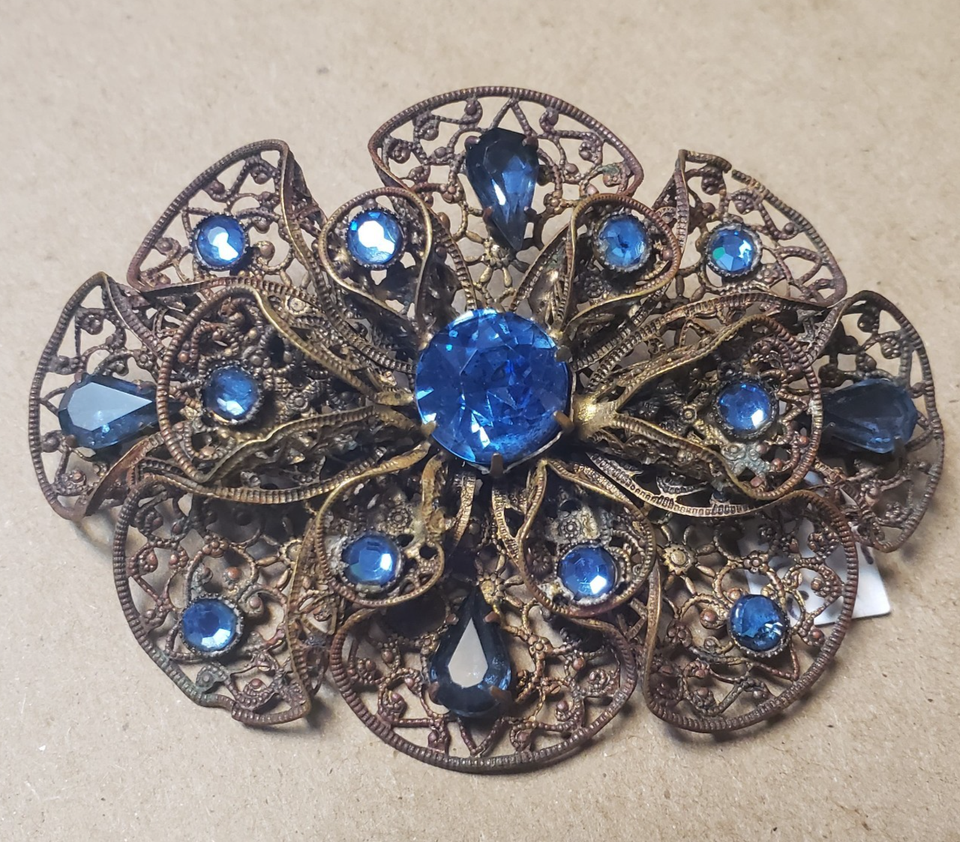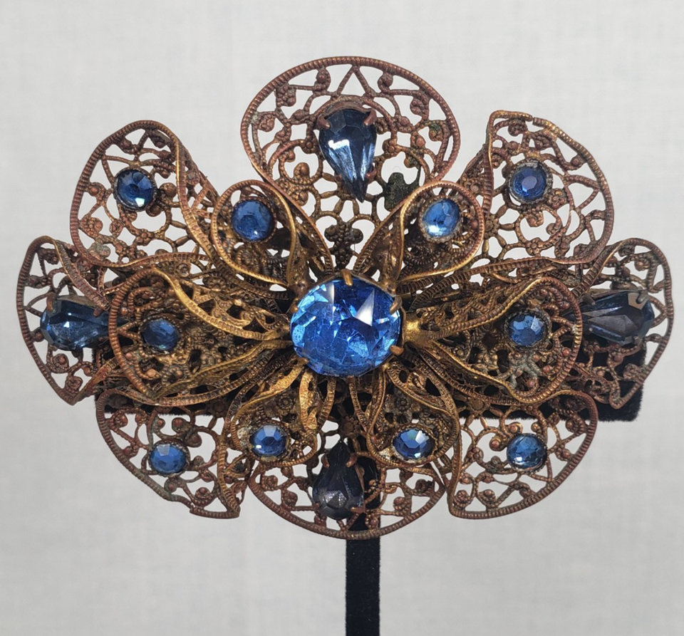 - Antique Czech Art Deco Large Blue Glass Gold Tone Filigree Brooch