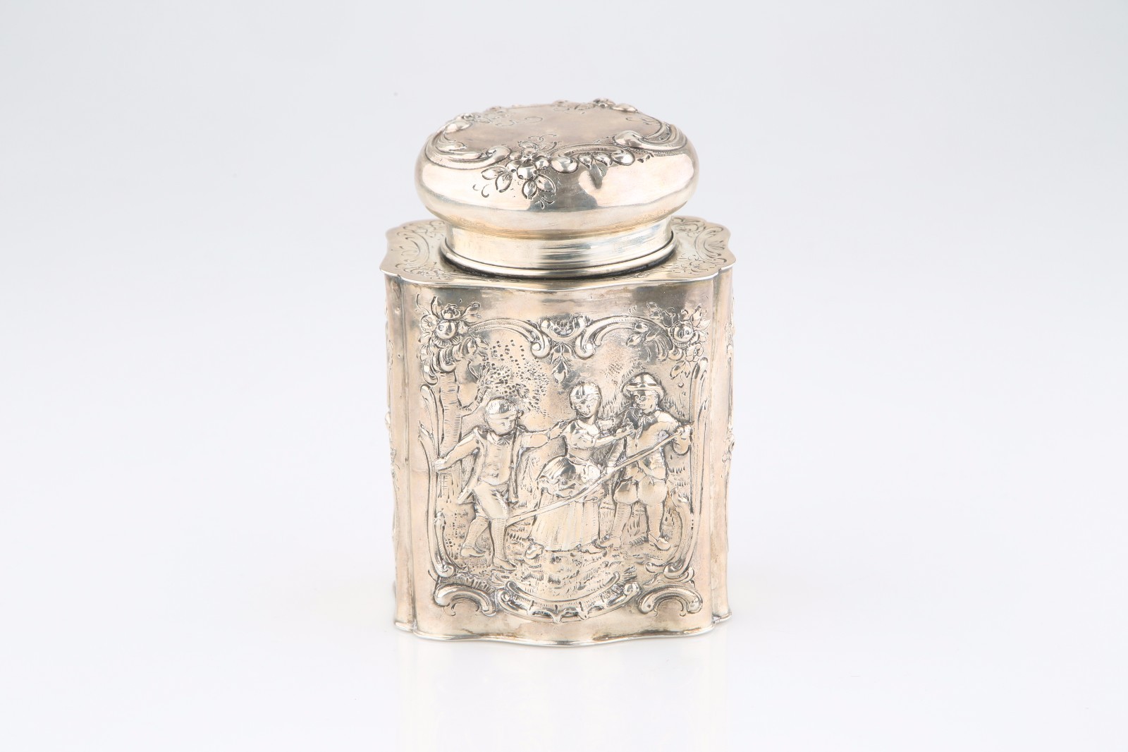 Antike deutsche Repousse Tee Caddy Jar 800 Silberszenen des Spiels mit Deckel 218.6g