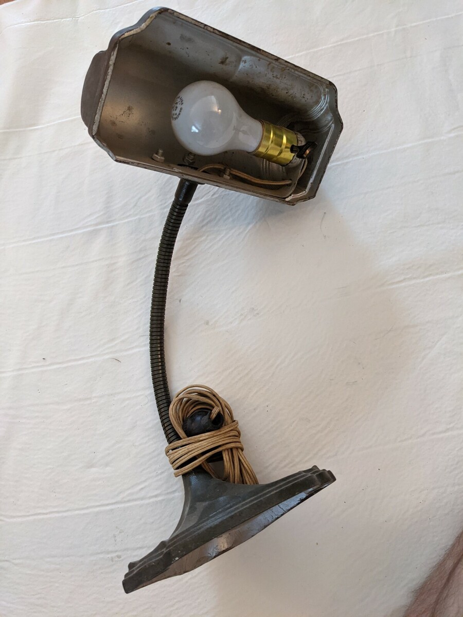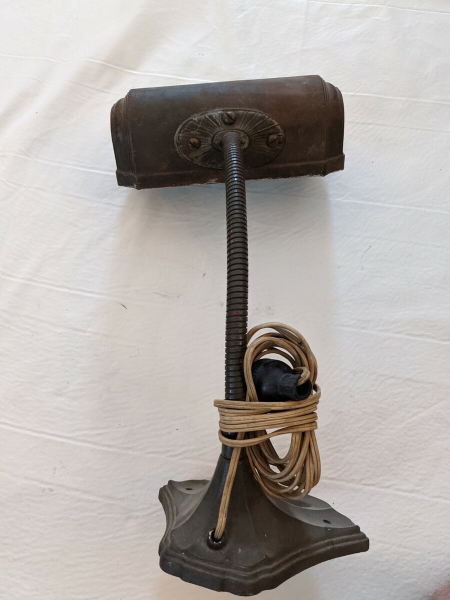A vendre est une lampe de bureau electrique en metal marron antique de travail d'occasion Art deco avec col articule USA.
