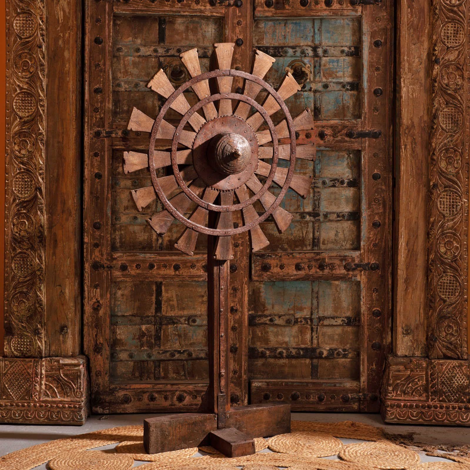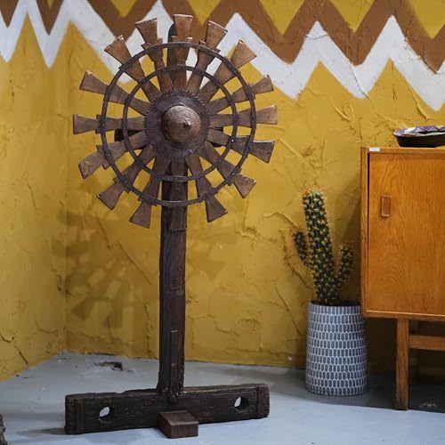 Product description: Transform your space with this extraordinary antique handmade windmill gear towel rack. Meticulously crafted by skilled artisans using reclaimed iron from authentic machinery, this 29-inch tall by 14-inch wide statement piece brings industrial vintage charm to any setting. The striking large cog and spoke design, mounted vertically on a solid geometric stand, serves multiple purposes?hang towels in the bathroom, display scarves in the bedroom, organize jewelry, or simply appreciate it as a sculptural art piece. Each rack preserves the original patina, texture, and handmade character, with natural marks and irregularities ensuring your piece is truly one-of-a-kind. The sturdy 8-inch deep base provides stability without installation requirements. Perfect for entryways, lofts, or bohemian-inspired spaces, this rare collector's item seamlessly blends history, functionality, and artistic expression for those seeking distinctive decor with authentic character.