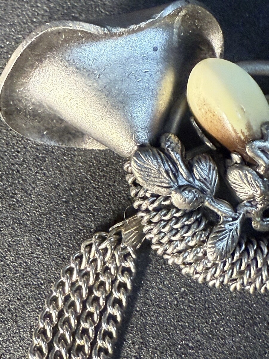This Antique Hunting Horn Brooch Pin with Grandl And Oak Leaf is a beautifully crafted piece of 835 German Silver jewelry. The brooch features intricate details of a hunting horn and oak leaf, showcasing a vintage charm that is perfect for various occasions such as weddings, birthdays, or anniversaries. The silver color and white main stone add a touch of elegance, while the handmade nature and original design make it a unique and special accessory for both men and women. Signed by the maker, this brooch is a timeless piece that captures the beauty of nature and tradition.