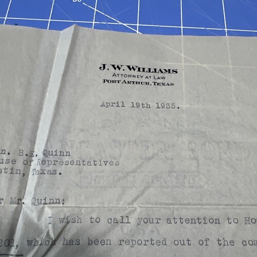 - Antique Letter 1939 Port Arthur Texas Attorney At Law J. W. Williams Signed