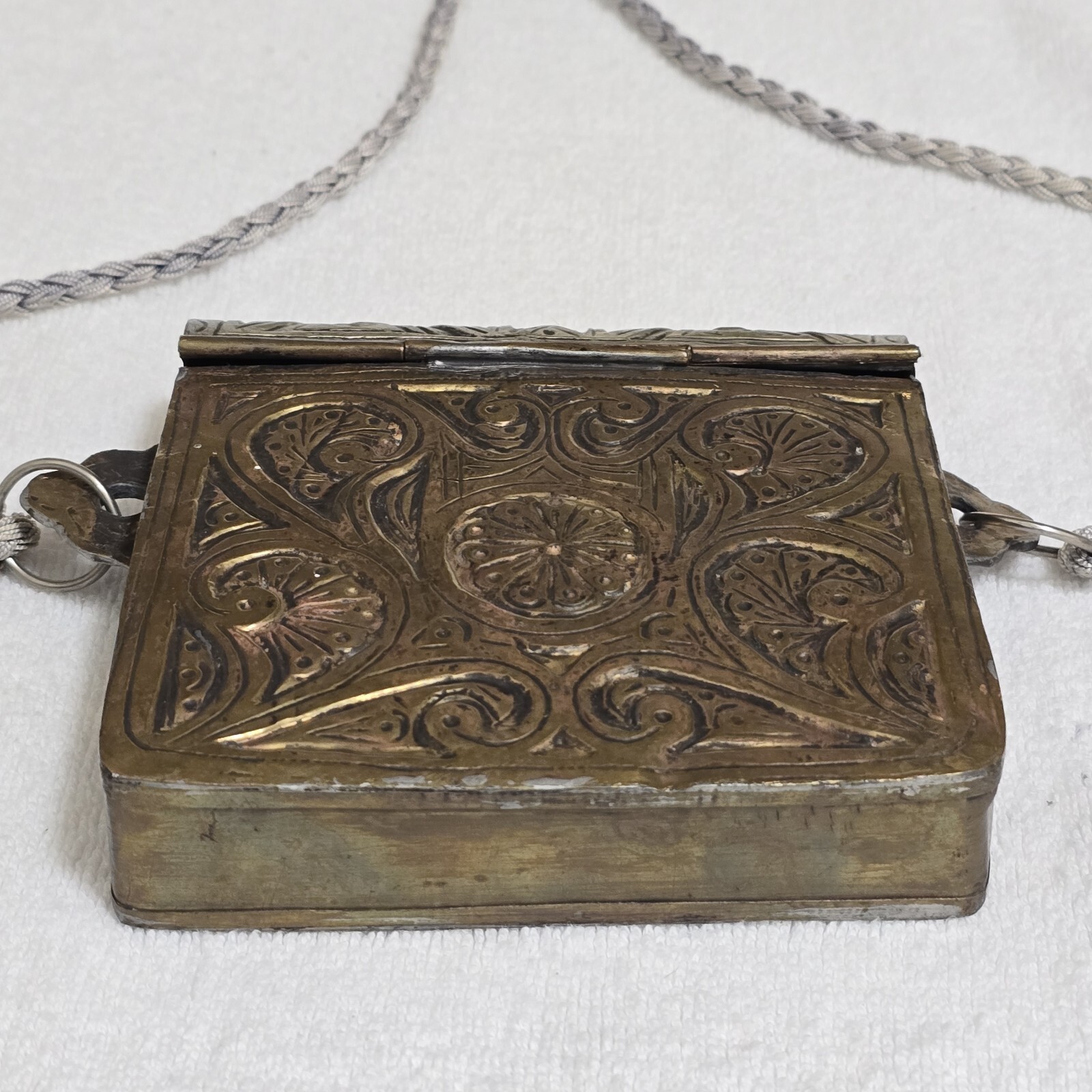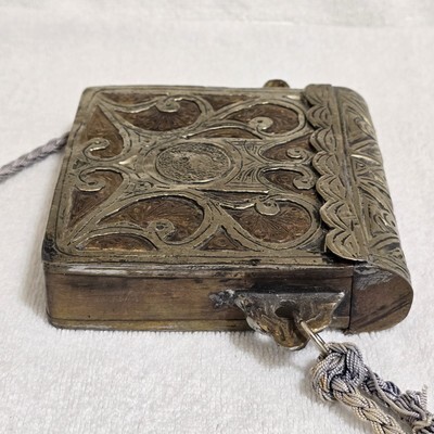 Antique Late 1800s Moroccan Arabic Brass / Copper Ornate Scrollwork Design Quran Prayer Amulet Box / Holder - Approximately 4.75" x 4.75" x 1.25". Full length across the handles 6.25". This weighs 13.3 oz. Includes an aftermarket braided cord as the strap.