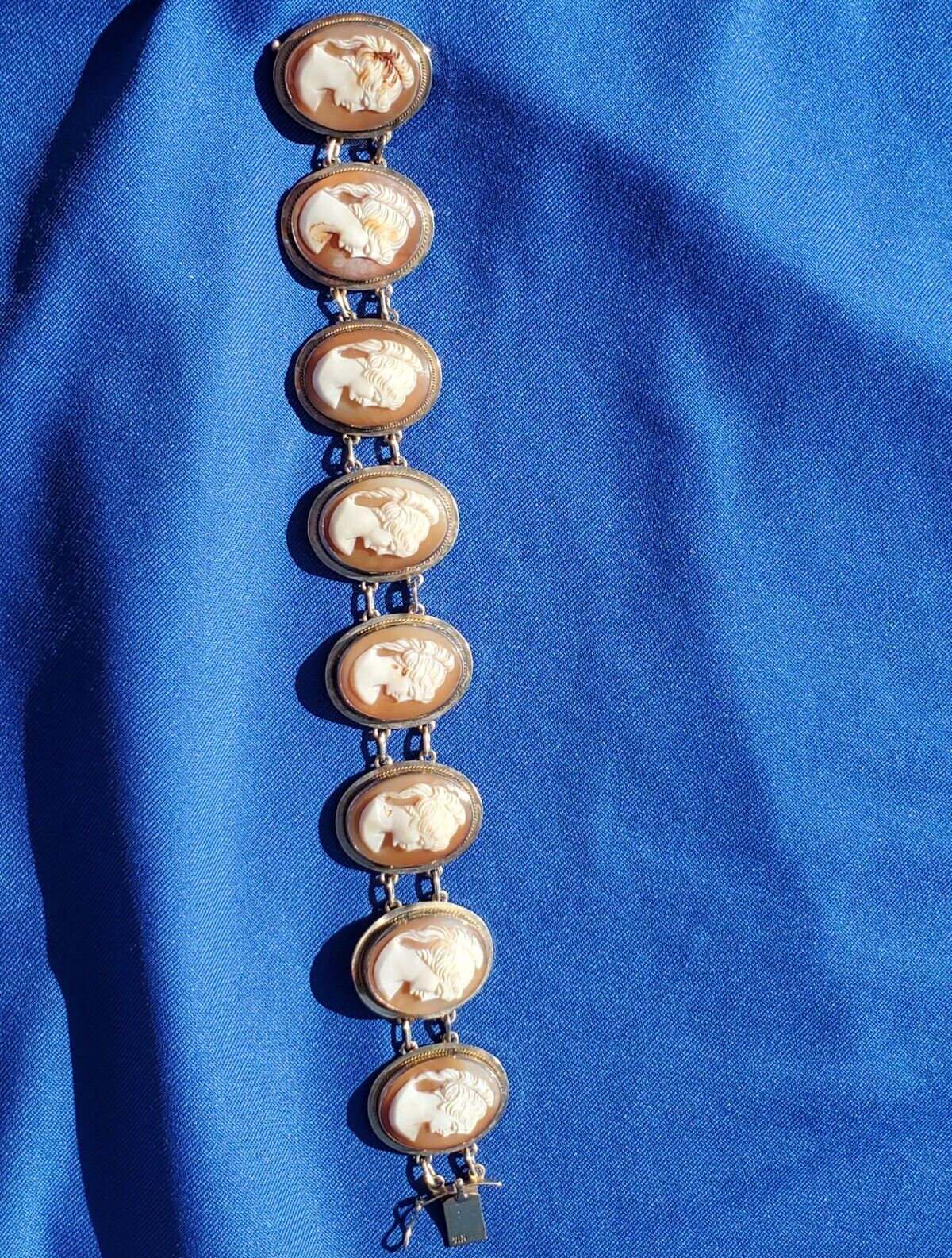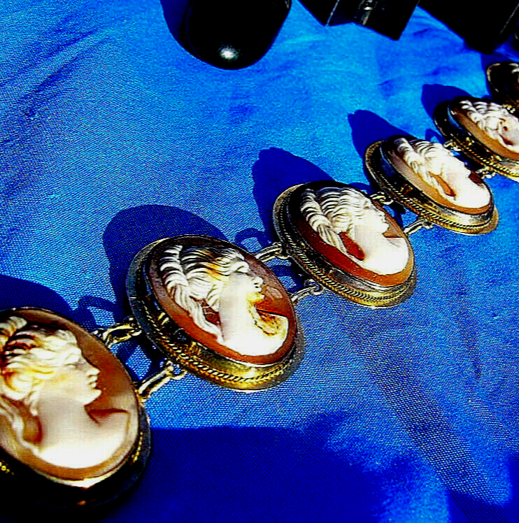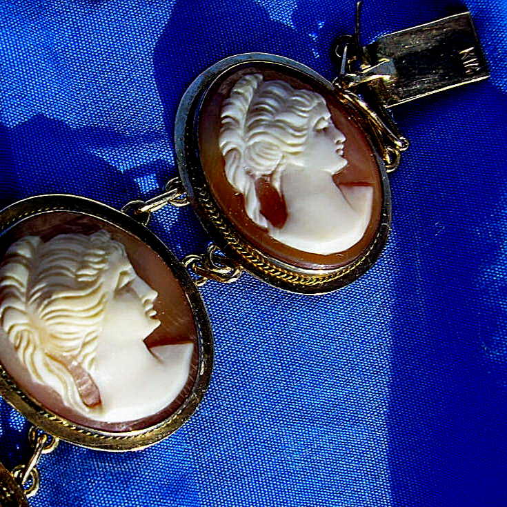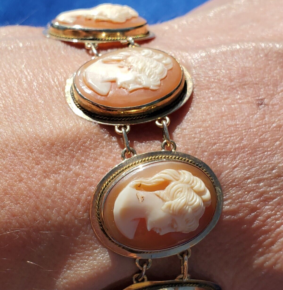 FANTASTIC ANTIQUE PICTORIAL CAMEO 14K GOLD BRACELET.