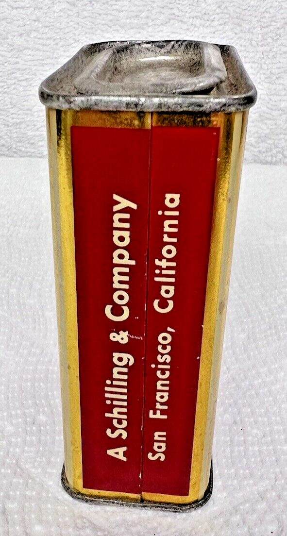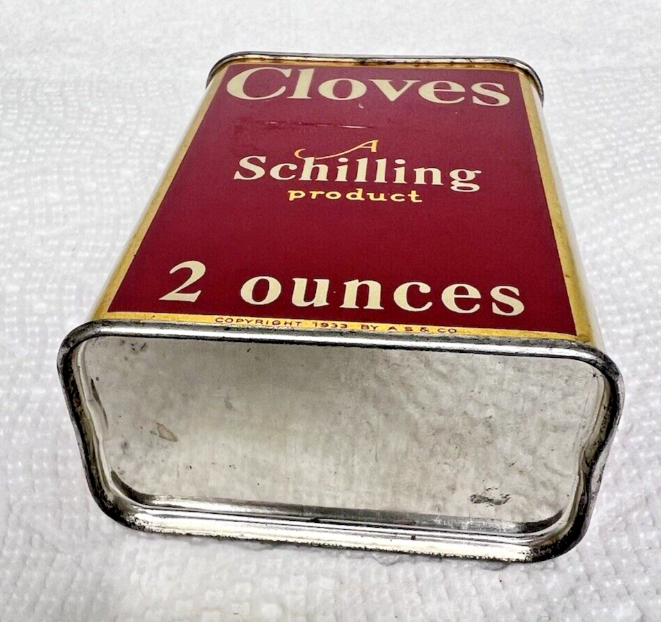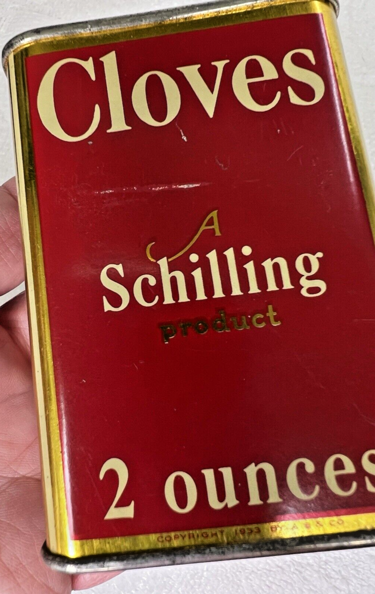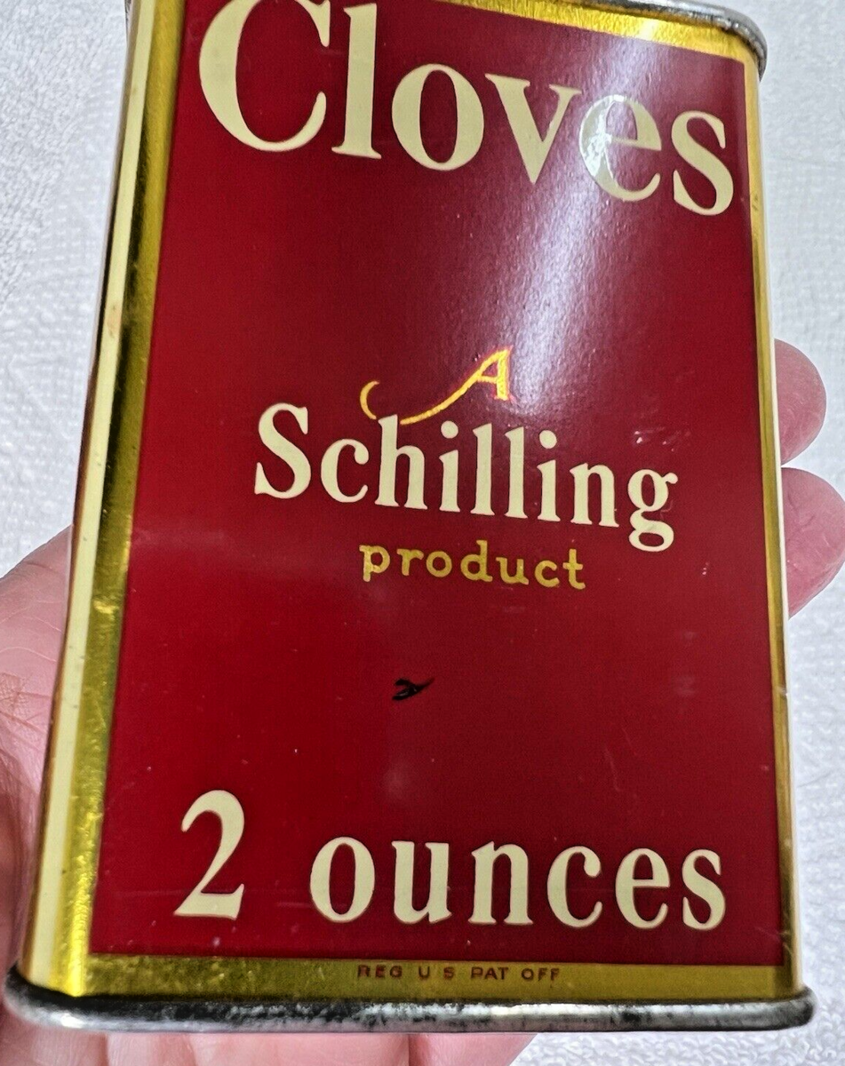 - Antique Schilling Cloves Tin Litho Can 2 Oz 3 1/4 inch Red Gold Spice Kitchen