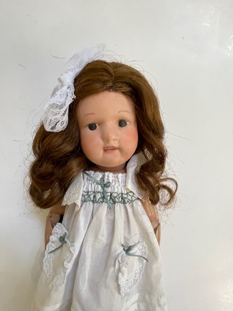Lovely Dolly Face Schoenhut doll measures 15 inches tall. She has the Schoenhut decal on her back. Black light shows light retouch to her cheeks and nose. All wood - made in the USA. Happy to answer any questions you have. Spring jointed and fully poseable with the exception of her right hand, which is a nicely sculpted replacement. Replaced antique vintage human hair wig and adorable smocked sundress pinafore and bloomers are included as shown. Please be sure to carefully examine all photos as they help to serve as part of the description, and use the zoom feature as doll does show expected wear. Smoke free home. Thank you.