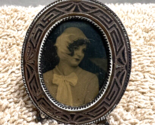 Antique Silver Faint Pink Tiny Photo Frame 1 3/4 x 1 5/8 Inch Miniature In Good shape there is some wear /or tarnishing on the silver we have not tried to clean it we kinda like it as it is. (the photo is original!)
