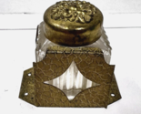 - Antique Small Inkwell Glass in Bright Gold Metal Holder Scroll Lid