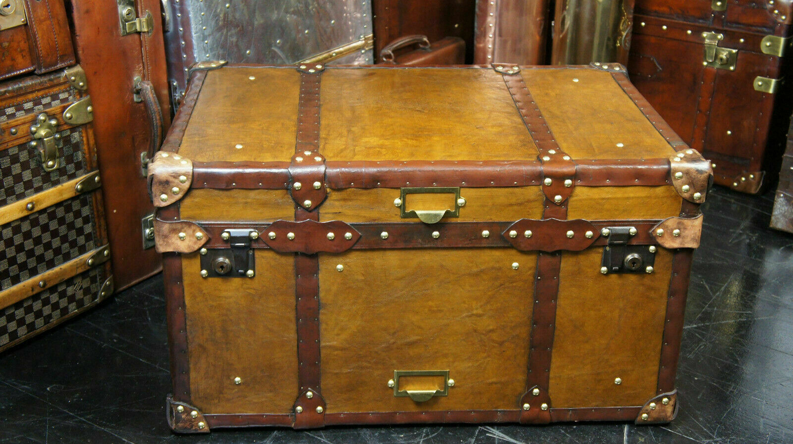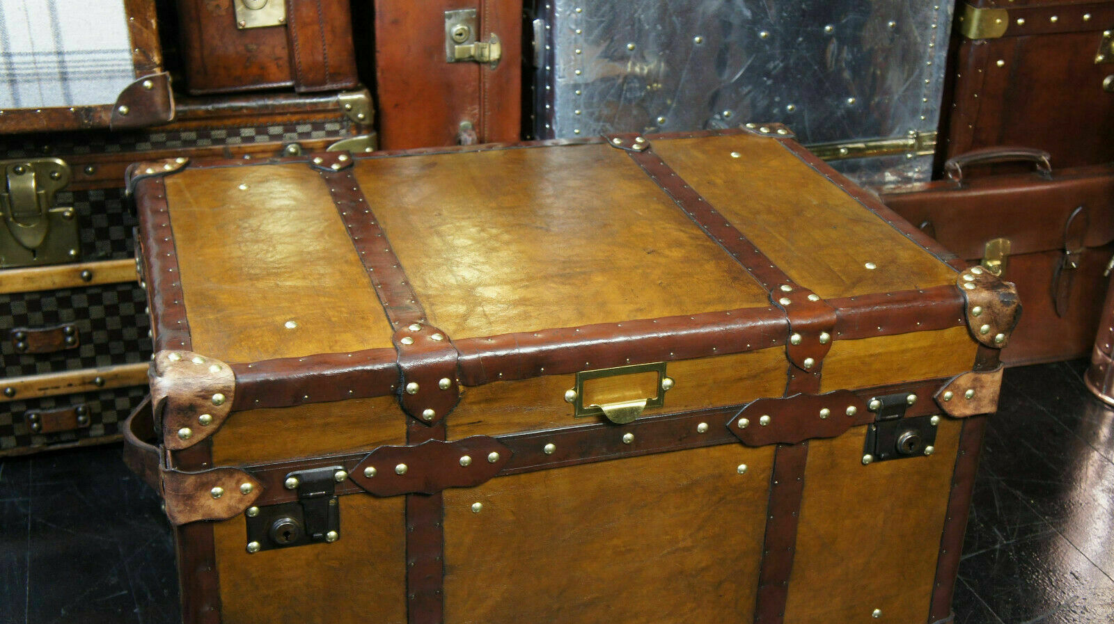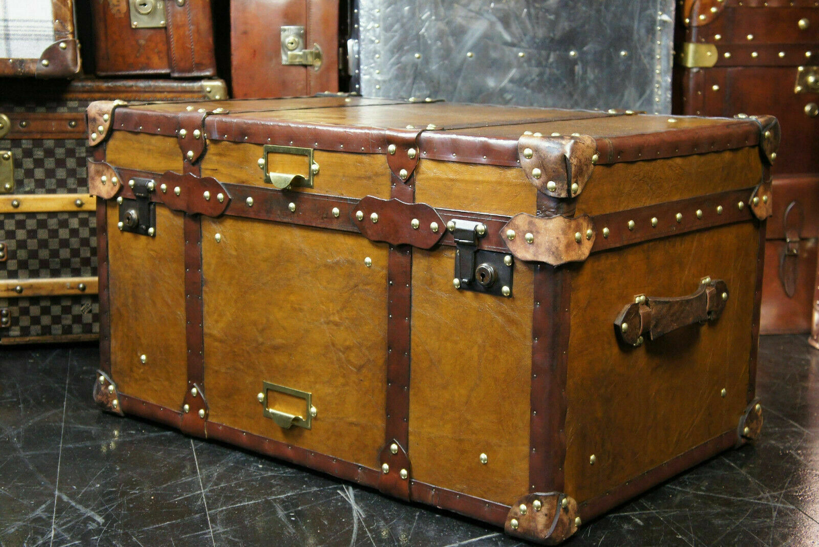 - Antique Tan Leather Coffee Table Chest Trunk with Antique leather Trim