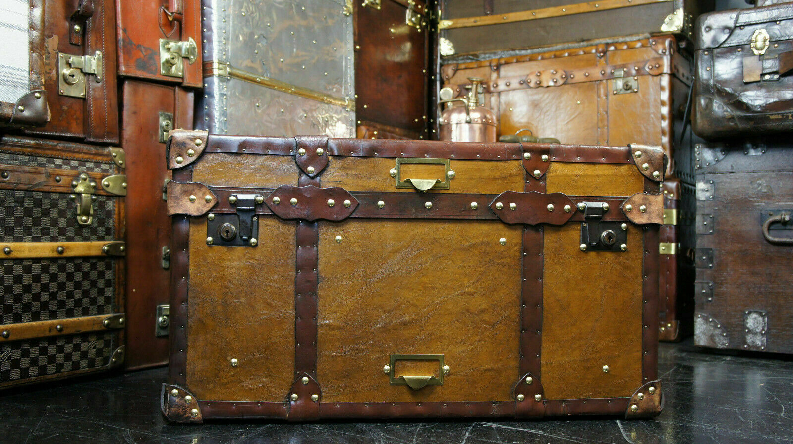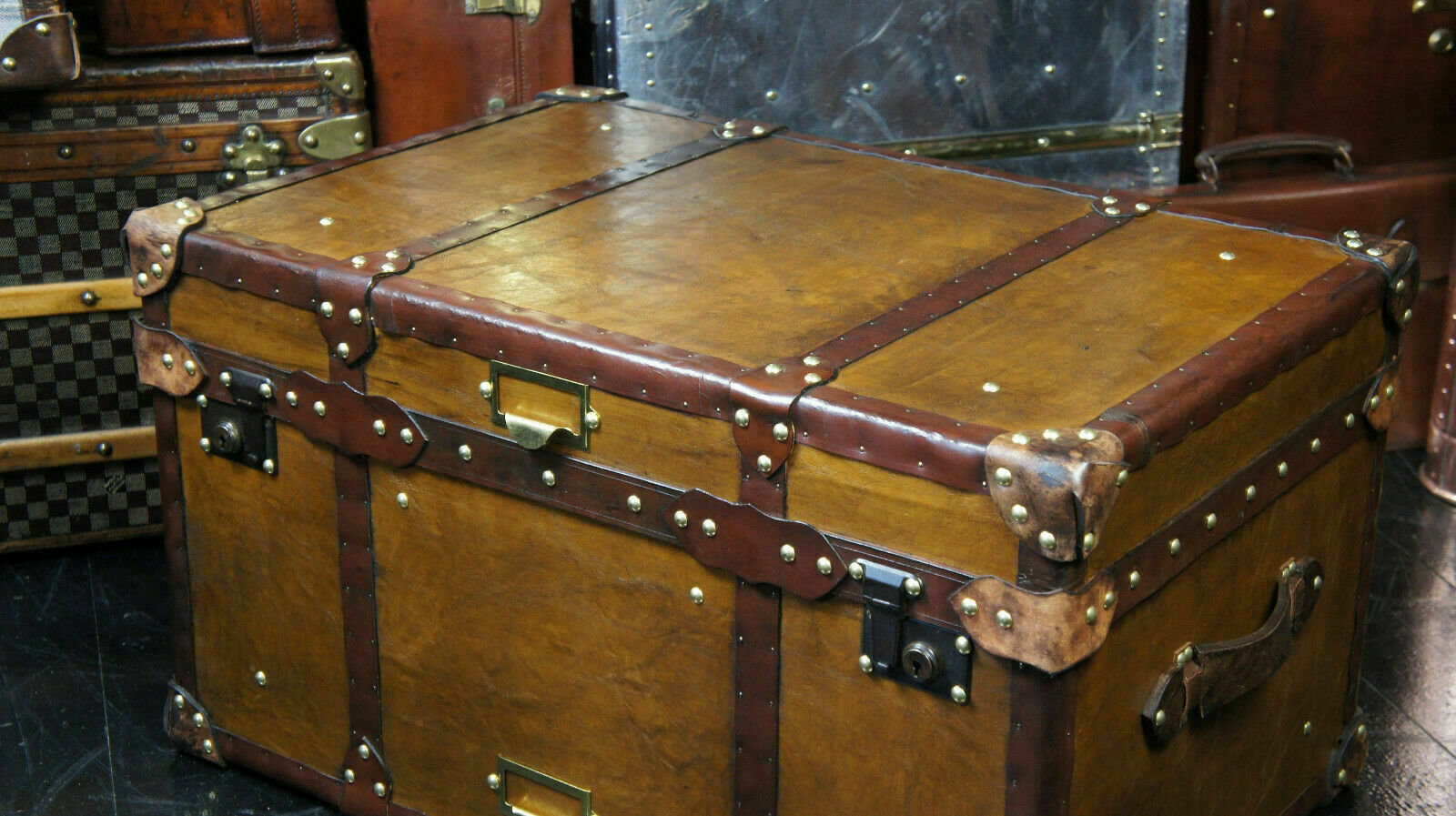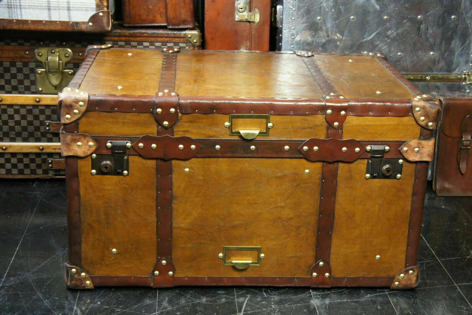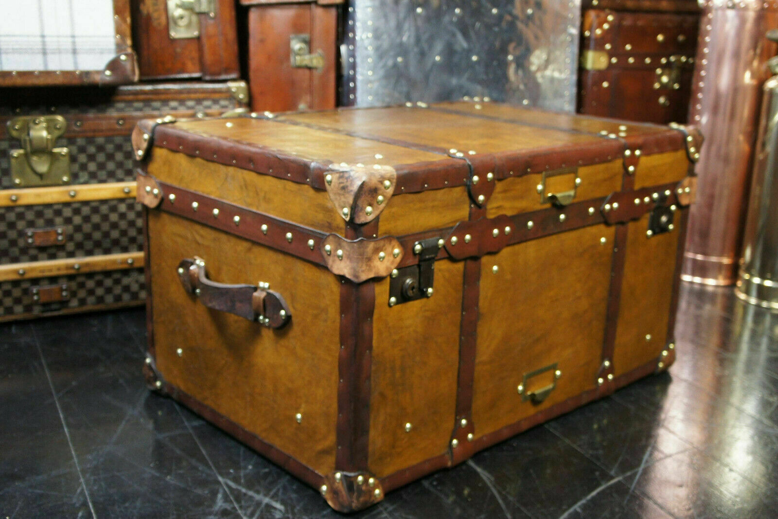 - Antique Tan Leather Coffee Table Chest Trunk with Antique leather Trim