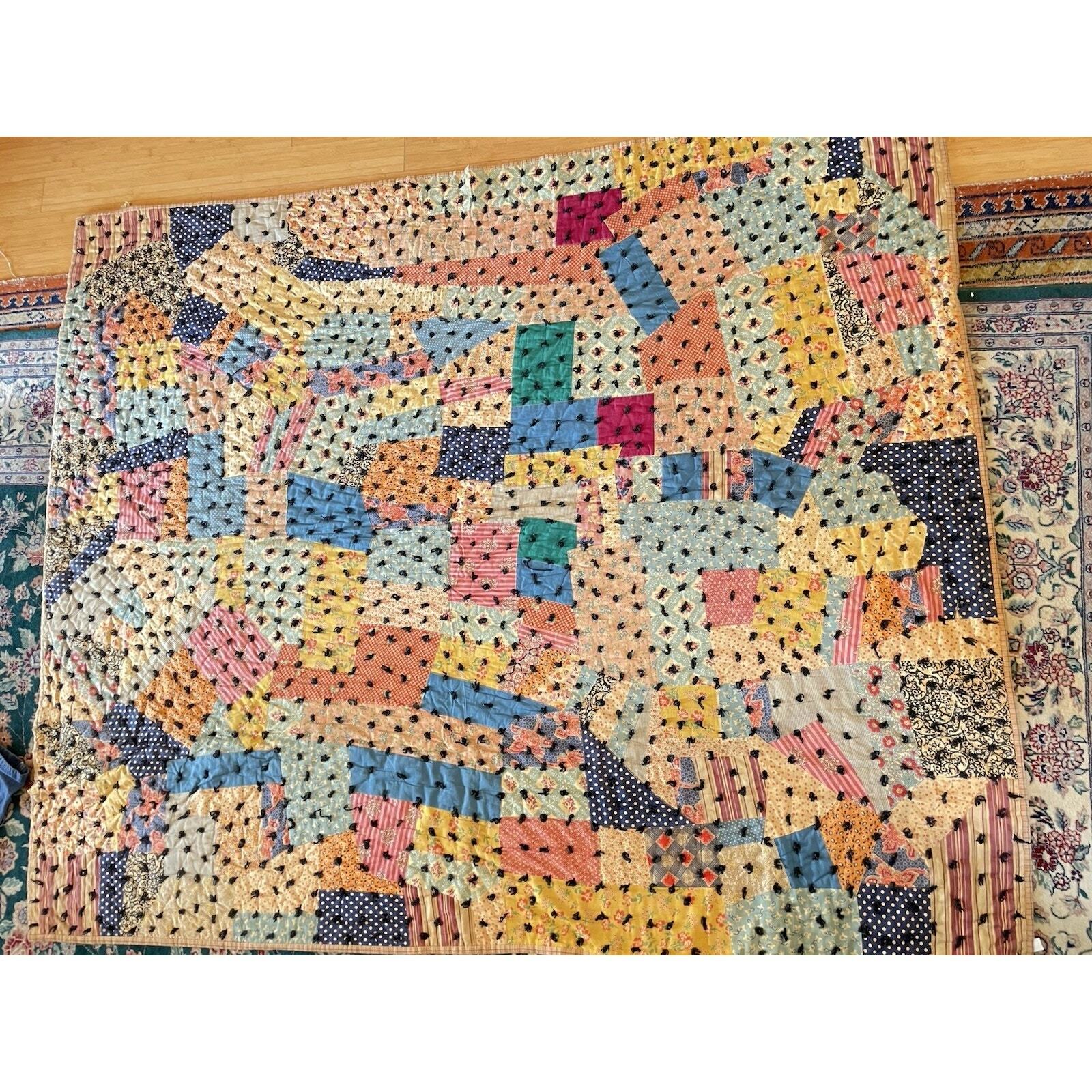 Antique Handmade Cotton Crazy Tied Quilt 79? X 65? Feed Sack Camp Blanket ? Beautiful example of early American textile art featuring hand-tied quiltwork and authentic feedsack fabric. The backing is a classic camp blanket style, and the front is a patchwork of vibrant vintage cotton scraps, stitched with care. Some wear on the edge and one small hole (see photos). Quilt has not been washed and is in as found condition. This quilt is more muted in color but overall beautiful.