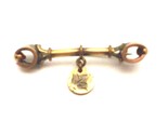 Delicate antique bar pin with what look like horseshoes on each end, and a small leaf etched dangle in center. It measures 1 1/4" long. Excellent condition- no gold markings but it is obvious upon inspection that it has gold content.