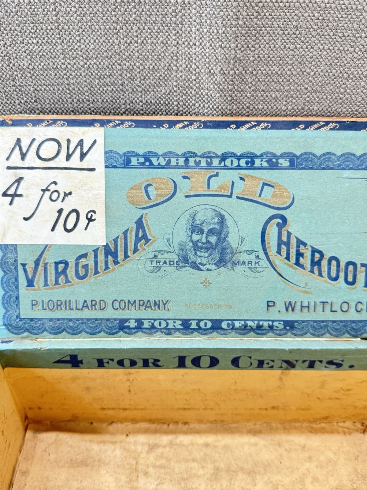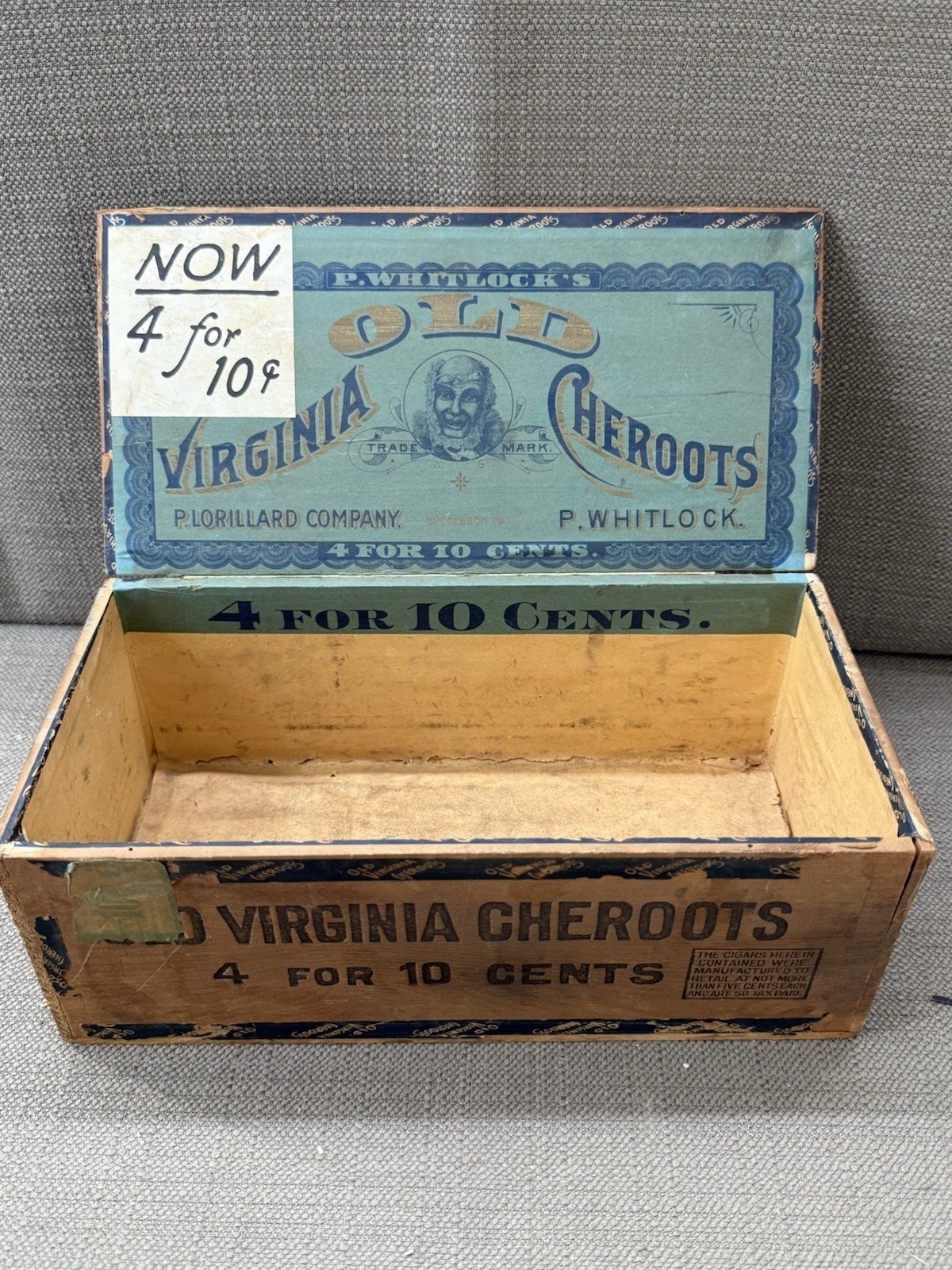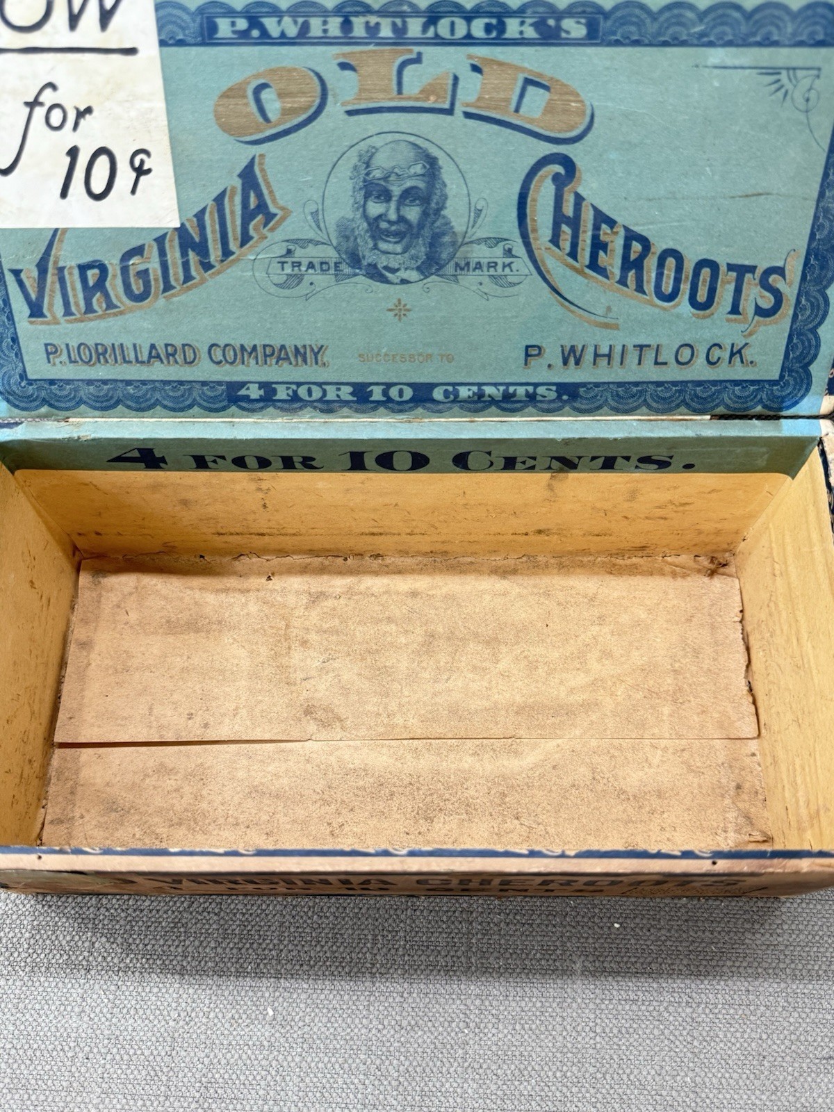 Original Old Virginia Cheroots wooden cigar box with striking blue and black typography and inner label marked ?P. Whitlock?s Old Virginia Cheroots ? P. Lorillard Company?. The tax seal and ?4 for 10 cents? pricing indicate production from the early 1900s?1920s era.