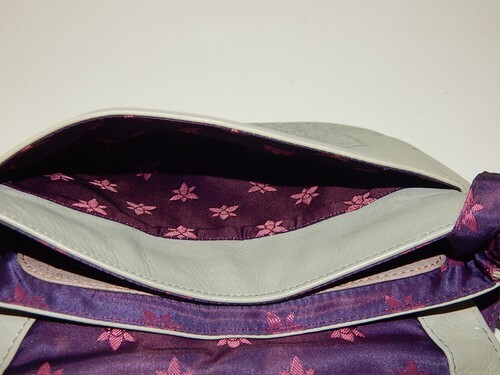 Interior: 1 zippered wall pocket, 1 multi-purpose gusseted pocket, 1 full-length slip pocket in front under flap, 1 rear full-length zippered pocket, long fabric key fob