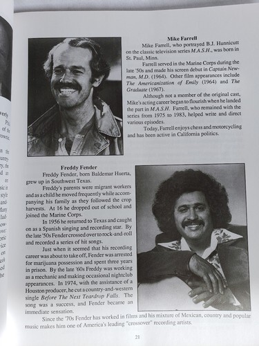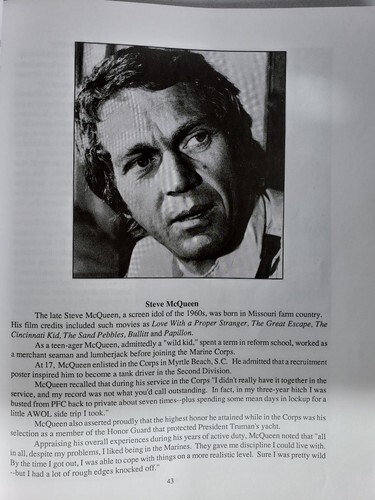 "When our project began, we knew of 30 notable personalities who were former Marines. Remarkably, within a year, our list had grown to more than 200. . . . This book will highlight the civilian careers and military experiences of Marines who have earned national recognition as entertainers, writers and broadcasters. . . .Our research sources include newspaper and magazine articles, biographies, biographical dictionaries, combat memoirs and interviews. Sheet music and Marine Corps ads have also been added to enliven the text. There was no valid method to qualify a Marine for inclusion in this book. We did not intend to slight anyone accidentally omitted from this work and invite our readers to suggest names of noteworthy Marines who may warrant recognition in future editions. Books describing Marine Corps courage and valor are legion. Instead, we strove to focus upon ordinary Americans who have served in the Corps and moved on to achieve fame in their chosen fields of endeavor. The individuals highlighted in this book, like the Marine Corps itself, reflect America's social and cultural diversity" [from the Preface]. Contents: "Celebrity Marines"; "Hollywood And The Marines"; "Television And The Marines.