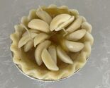 The Apple Pie 5" Candle is a specialized candle shaped like a pie, with a yellow color and a holiday theme. It features 3 wicks and emits an apple scent, creating a cozy and festive atmosphere in any room. This small-sized candle is perfect for adding a touch of warmth and celebration to your home during the holidays or any time of year. Some pieces are a little loose. Don?t think you would ever want to light this. Just too pretty!!!