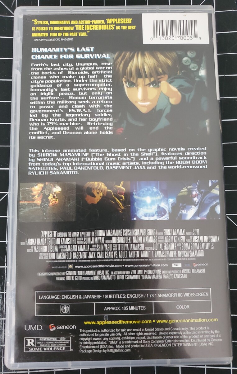 This listing is for the UMD for the Appleseed Movie. This is as released in English by Geneon. I bought this used and watched it all the way through. Everything is in decent condition but the case does have some wear on it due to age.