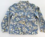 Description: Up for sale is an Appleseed's (NWOT) women's denim-styled jacket. This jacket is size 10M. It is made of 100% cotton fabric. It has a multicolored floral pattern in green, yellow, blue, black white on a medium blue background. It has a full button front and cuffs with 2 side slash pockets.
