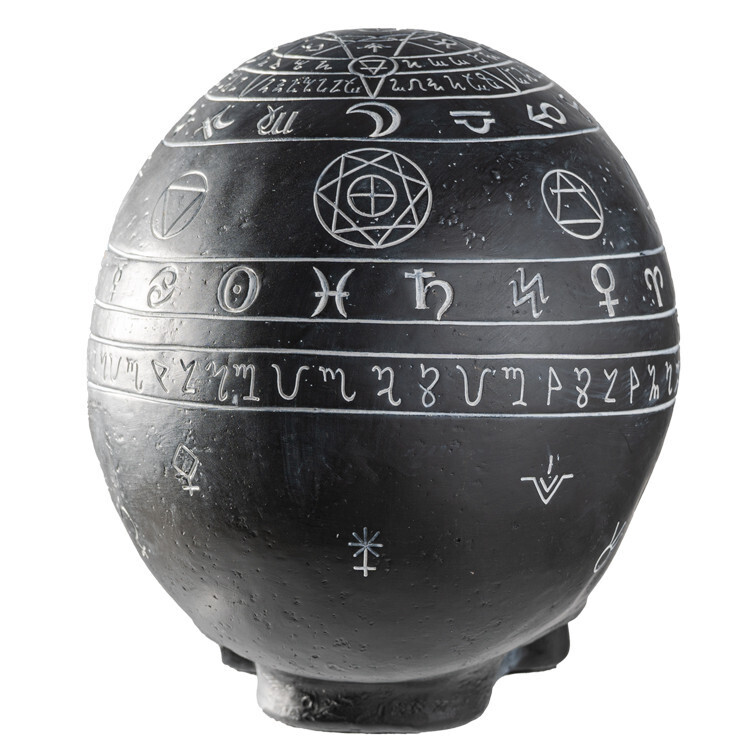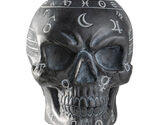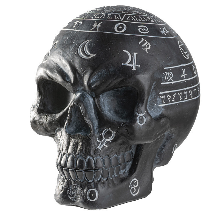 This 6x5x6 inch skull is covered in runes, theban (witch's) script, zodiac symbols and more. The lightweight material of cold cast resin makes it easy to move yet remain a focal point.