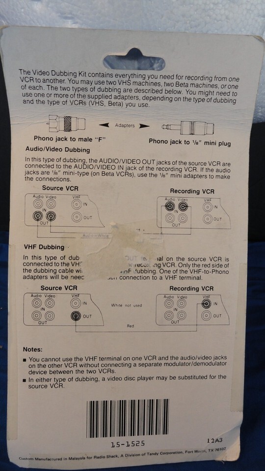 - ARCHER DUBBING KIT FOR RECORDING FROM ONE VCR TO ANOTHER GRAY